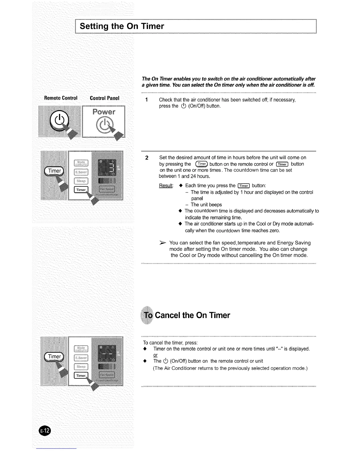 Samsung AW08ECB7 - Timer Settings; Setting the On Timer; Canceling the On Timer
