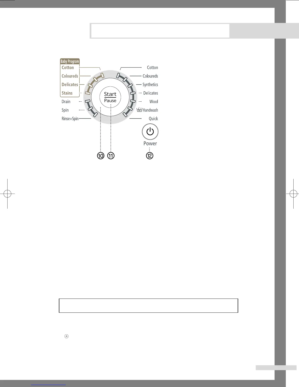 On/Off - To set the program on: Press the Start/Pause button to turn on the washing