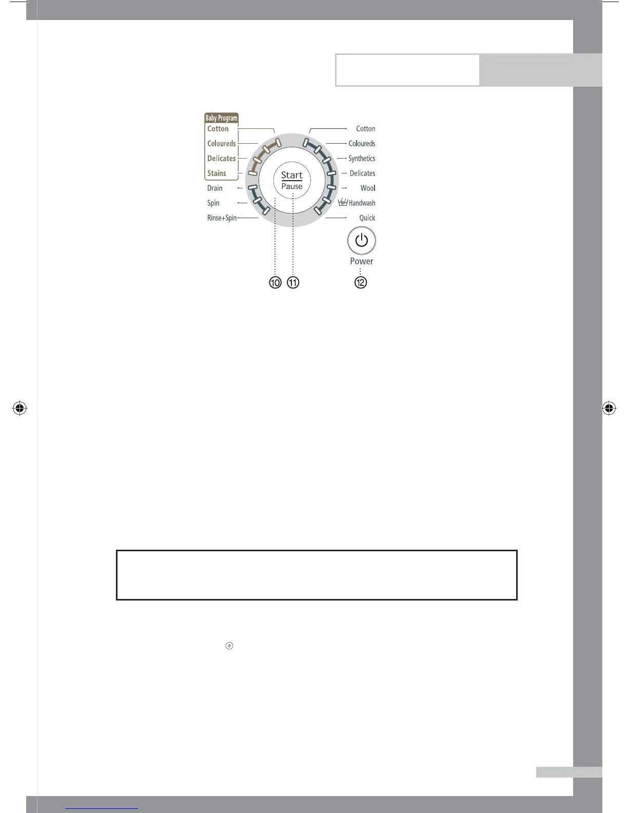 Za aktiviranje programa: Pritisnite gumb Start/Pavza, da vključite pralni stroj. Pritisnite in držite 2 – 3 sekunde