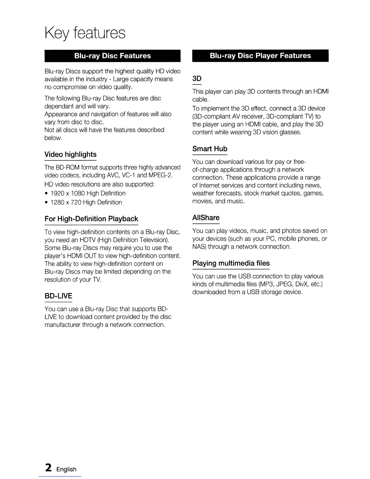 Samsung BD-D5500 - Key Features; Blu-ray Disc Features; Player Capabilities; Video and Playback Features