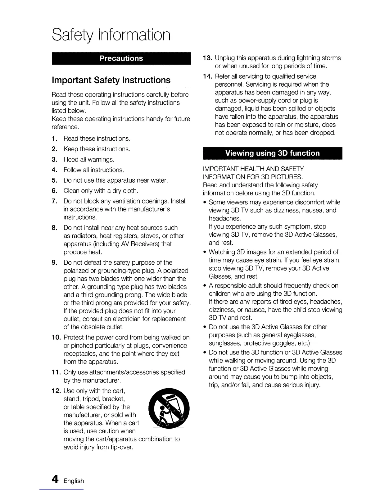 Samsung BD-D5500 - Important Safety Instructions; 3 D Viewing Precautions