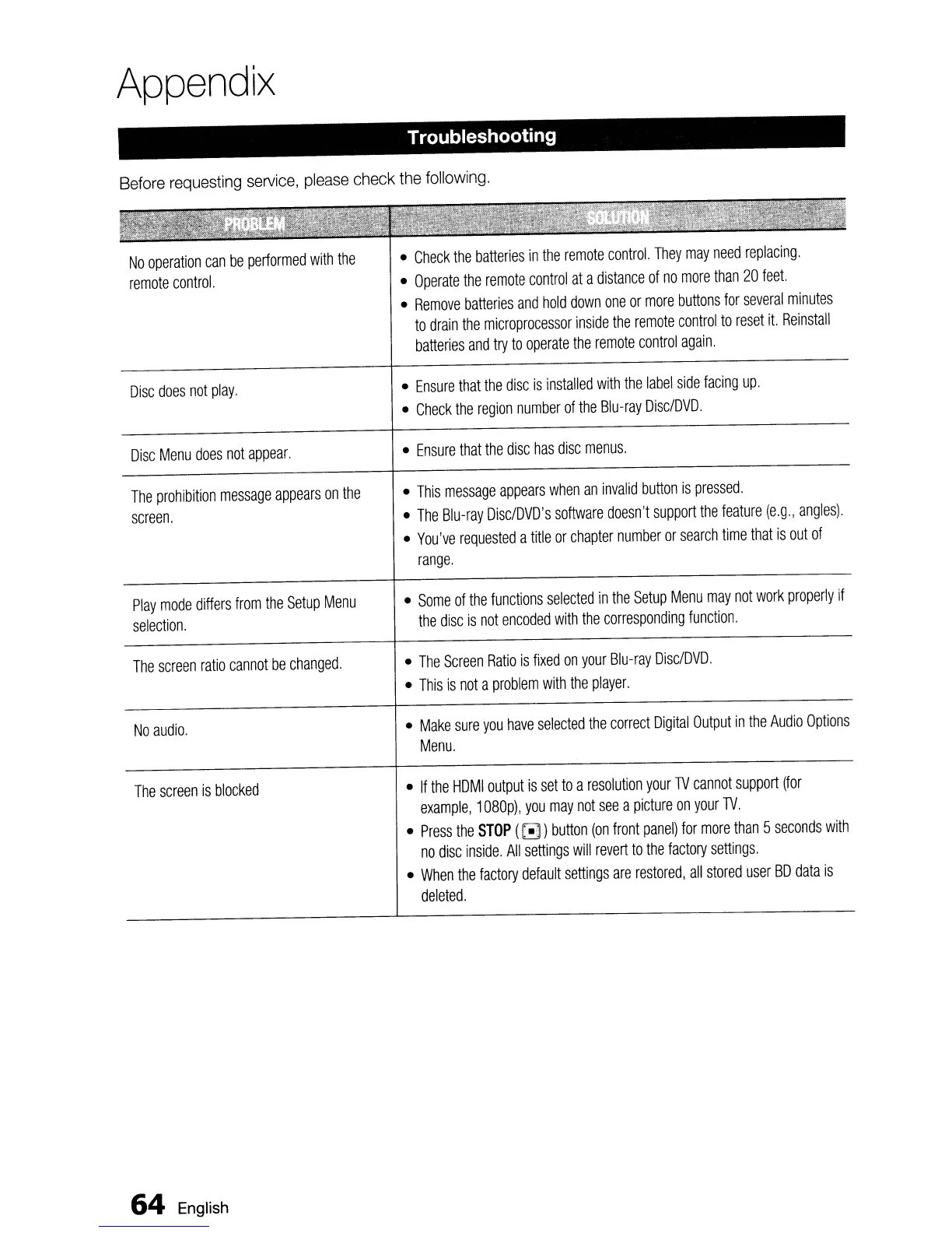 Samsung BD-D5500 - Appendix; Troubleshooting Guide