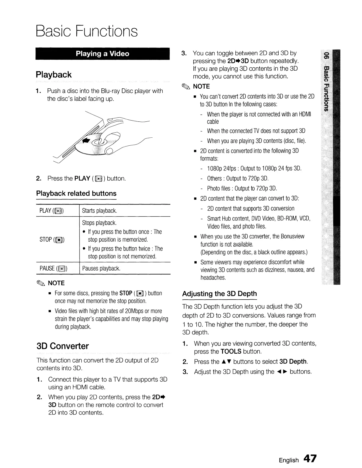 Samsung BD-D7500 - Playing a Video; Playback; 3 D Converter