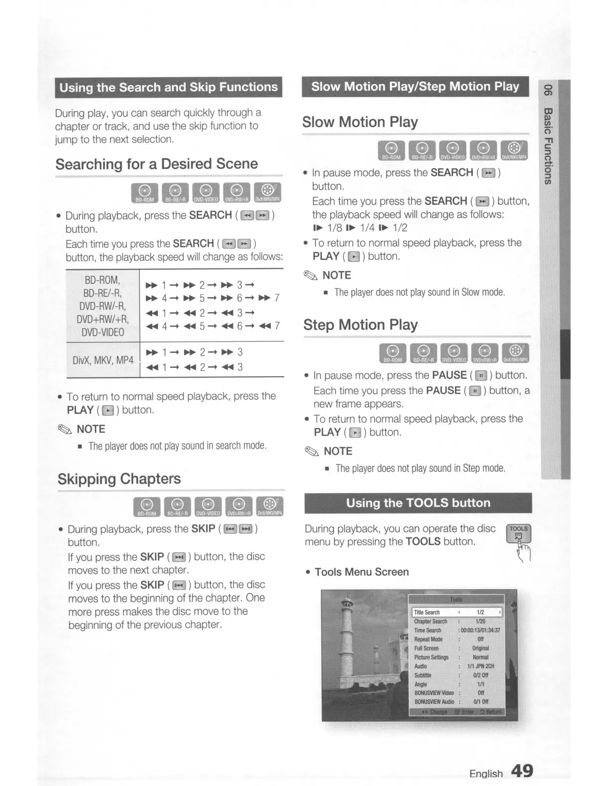 Samsung BD-D7500 - Using the Search and Skip Functions; Searching for a Desired Scene; Skipping Chapters; Slow Motion Play;Step Motion Play