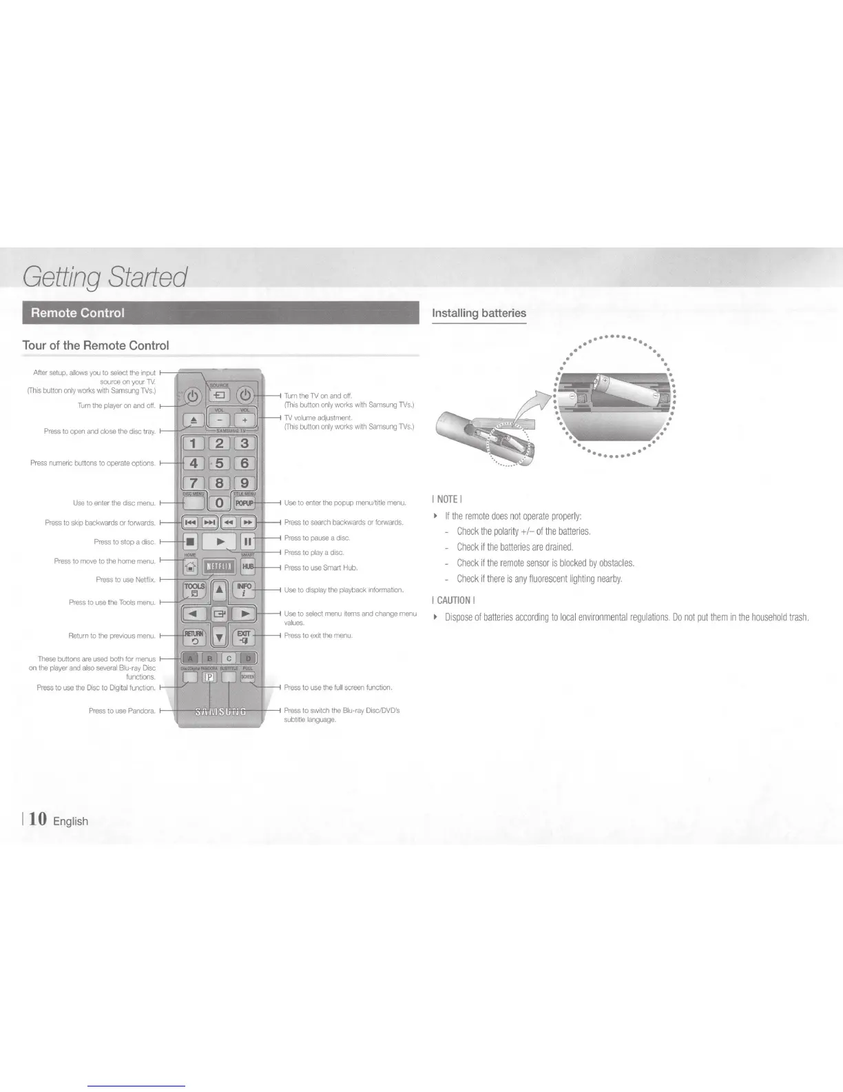 Samsung BD-E5700 - Getting Started: Remote Control Usage; Remote Control Button Functions; Installing Remote Control Batteries