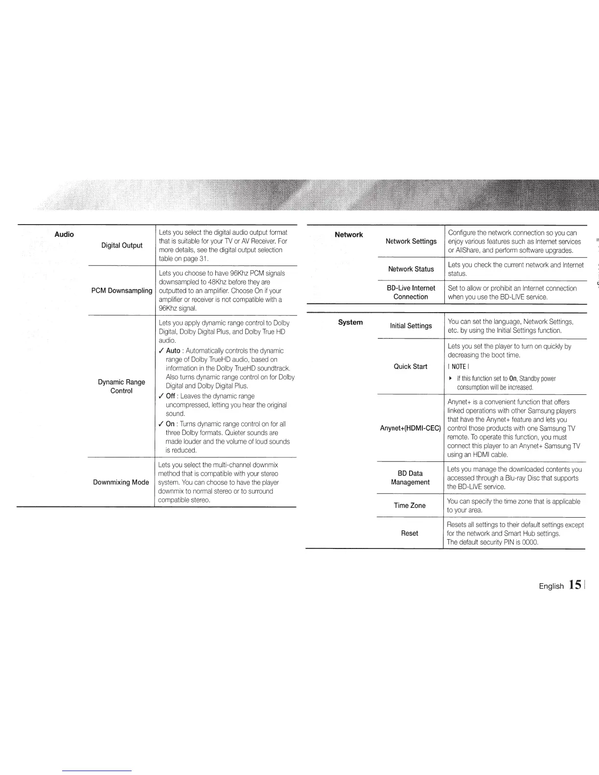 Samsung BD-E5700 - Settings: Audio, Network, and System Configuration; Audio Output Configuration Options; Network Connection and Status Settings; System Settings and Features Management