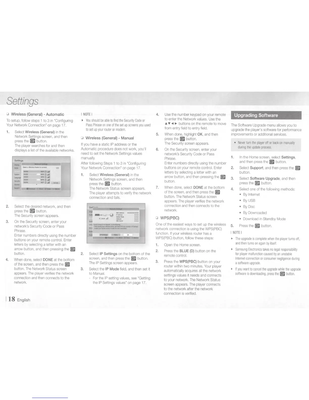 Samsung BD-E5700 - Settings: Wireless Network and Software Upgrades; Wireless Network Connection Methods; Software Upgrade Procedures and Options
