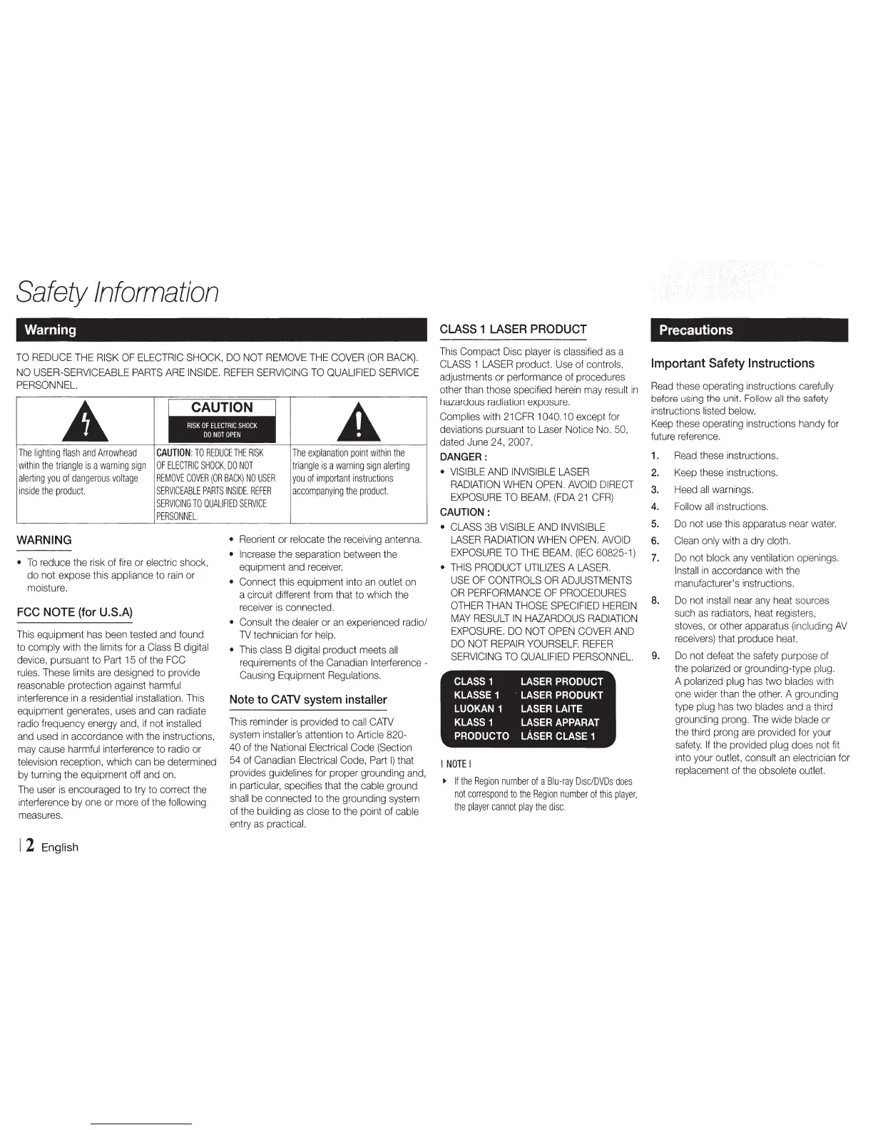 Samsung BD-E5700 - Safety Information and Precautions; General Safety Warnings and Precautions; Laser Product Safety Information; Important Safety Instructions