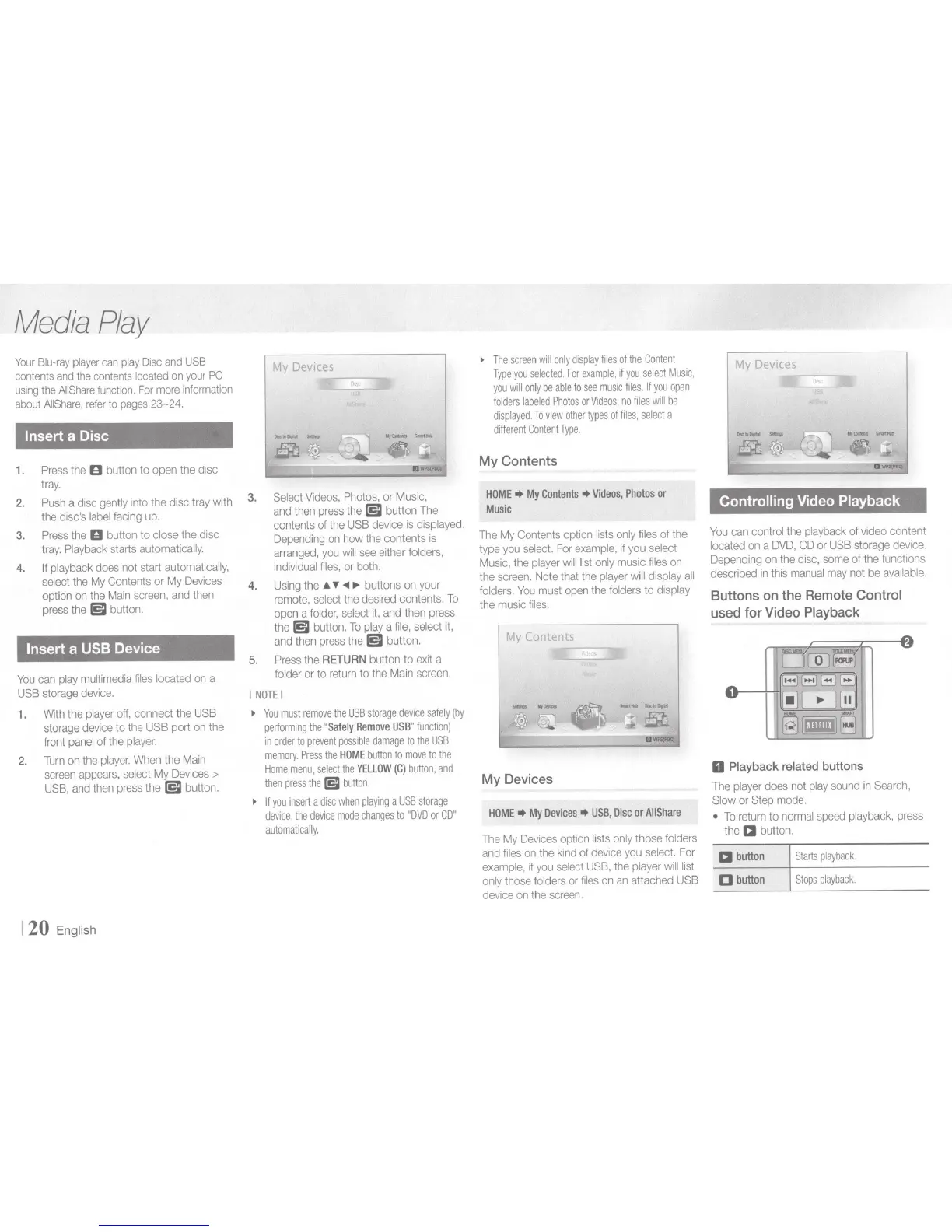 Samsung BD-E5700 - Media Play: Discs and USB Device Operations; Inserting Discs and USB Devices for Playback; Accessing Media Content via My Contents;My Devices; Controlling Video Playback Functions