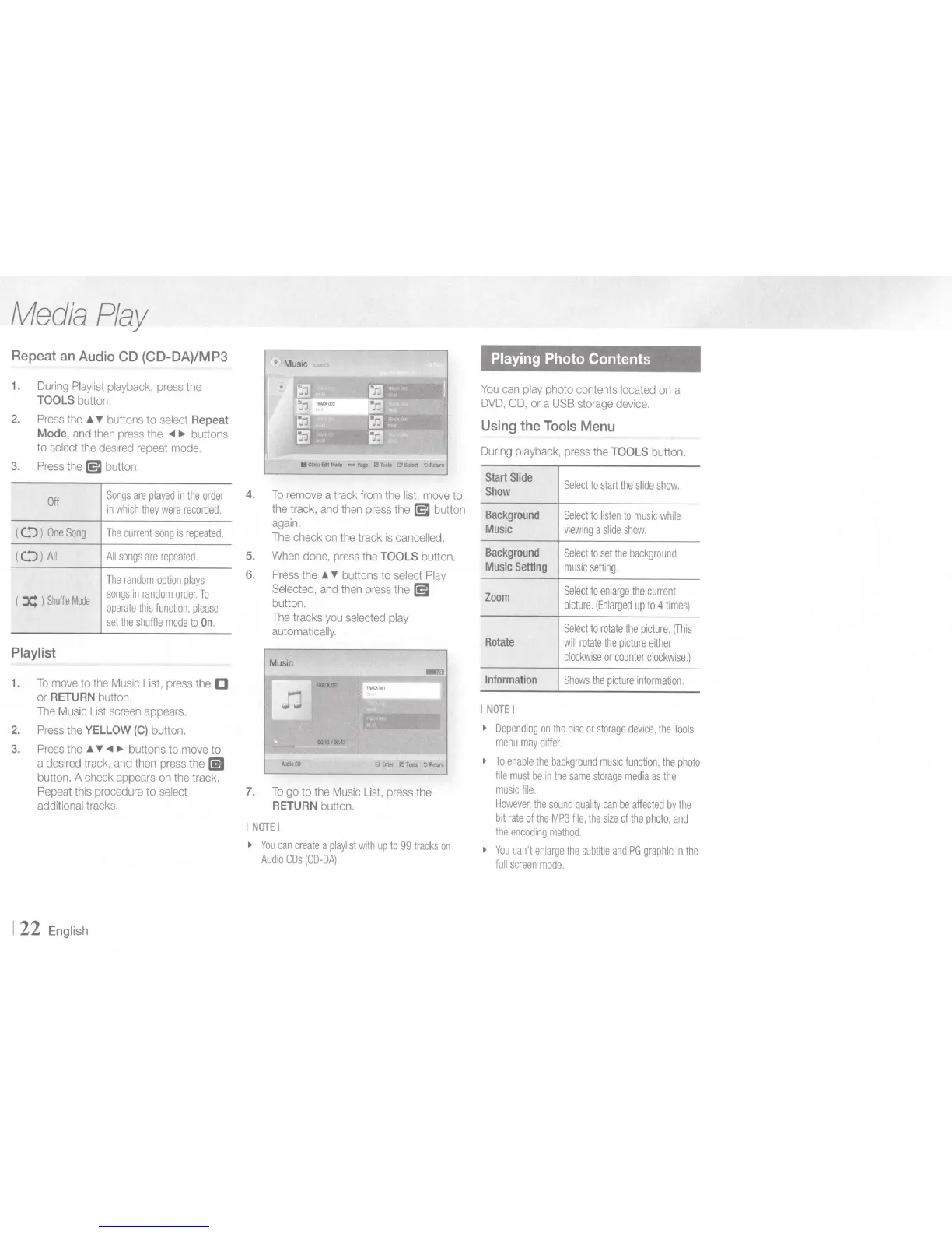 Samsung BD-E5700 - Media Play: Audio and Photo Playback Features; Audio CD;MP3 Repeat Modes and Playlist Creation; Photo Content Playback and Slideshows