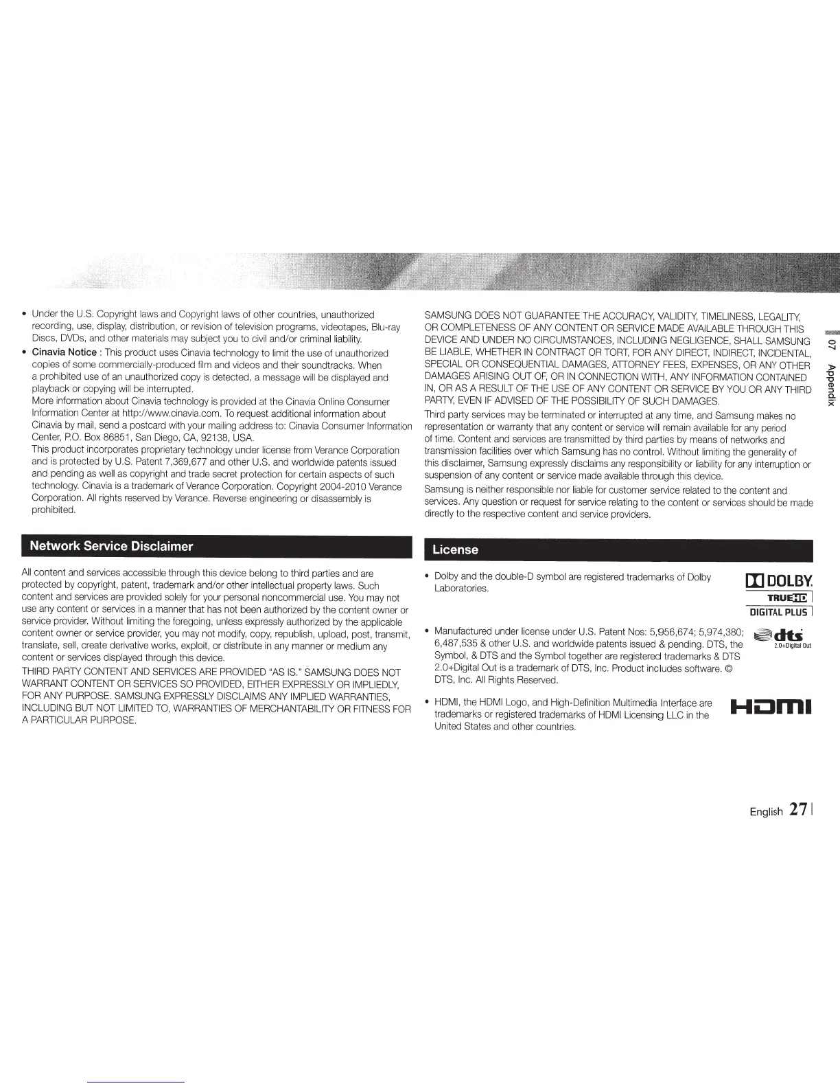 Samsung BD-E5700 - Appendix: Legal Disclaimers and Licensing Information; Network Service Provider Disclaimers; Software and Trademark Licensing Details