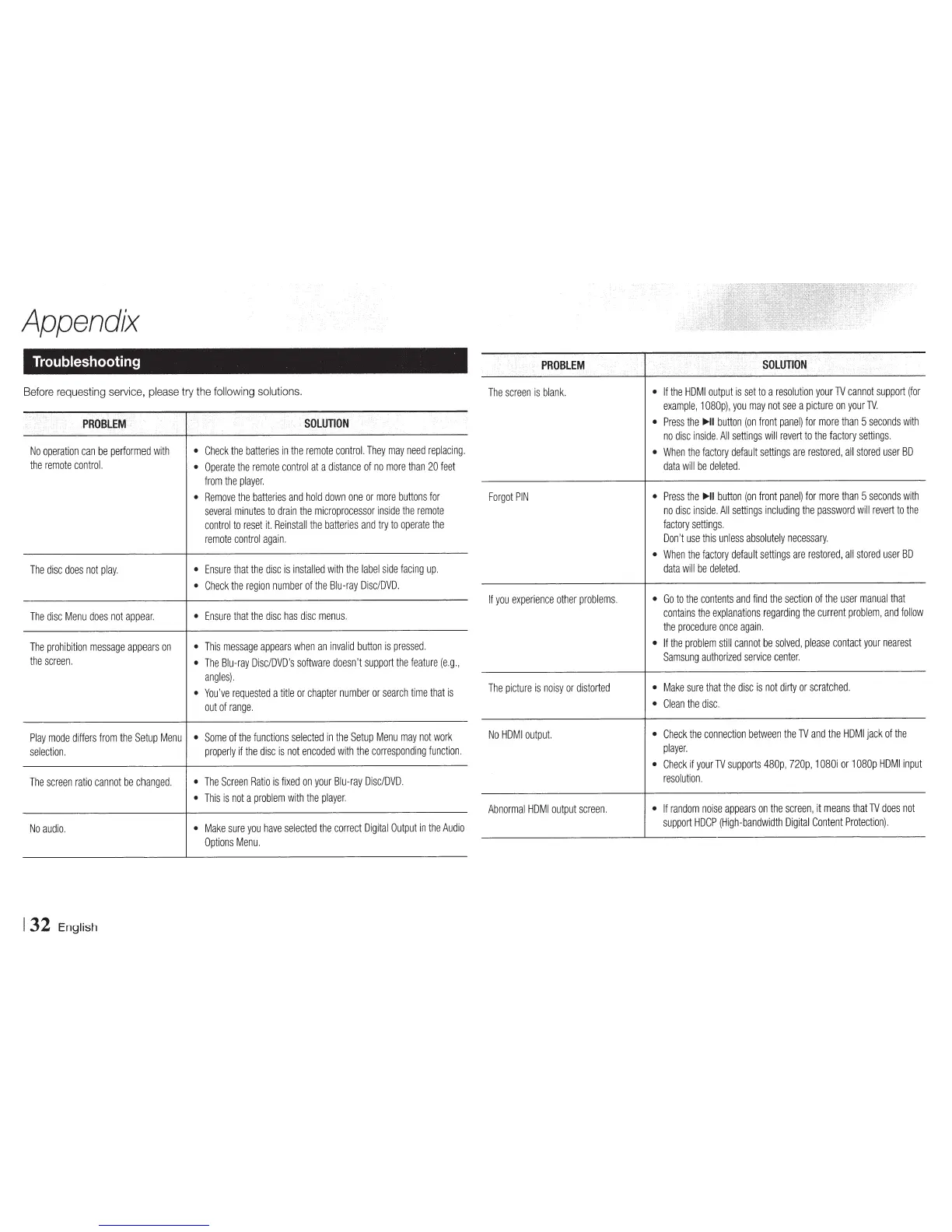 Samsung BD-E5700 - Appendix: Troubleshooting Common Issues; Troubleshooting Guide for Player Issues