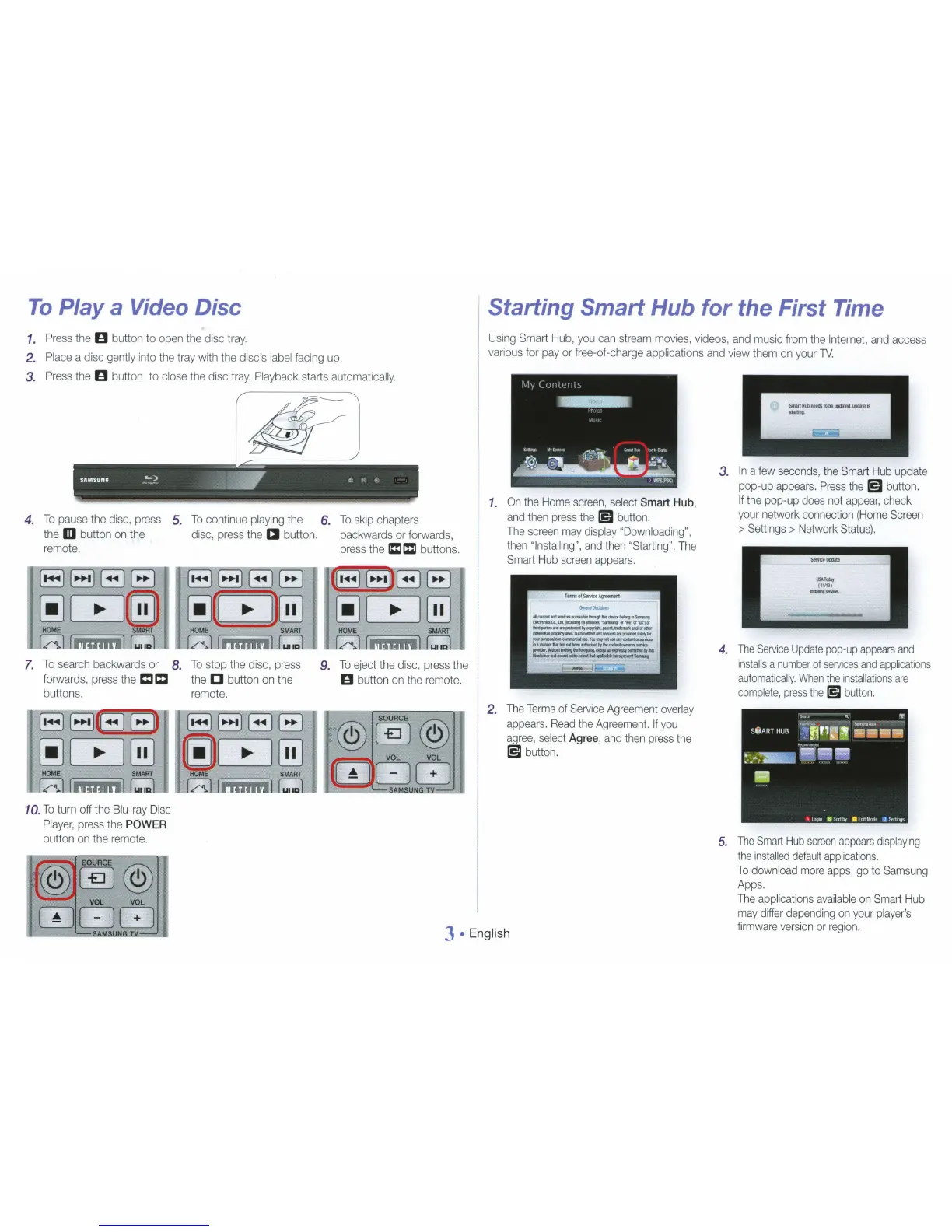 Samsung BD-E5700 - Playing Discs and Starting Smart Hub; How to Play a Video Disc; First-Time Smart Hub Setup and Launch