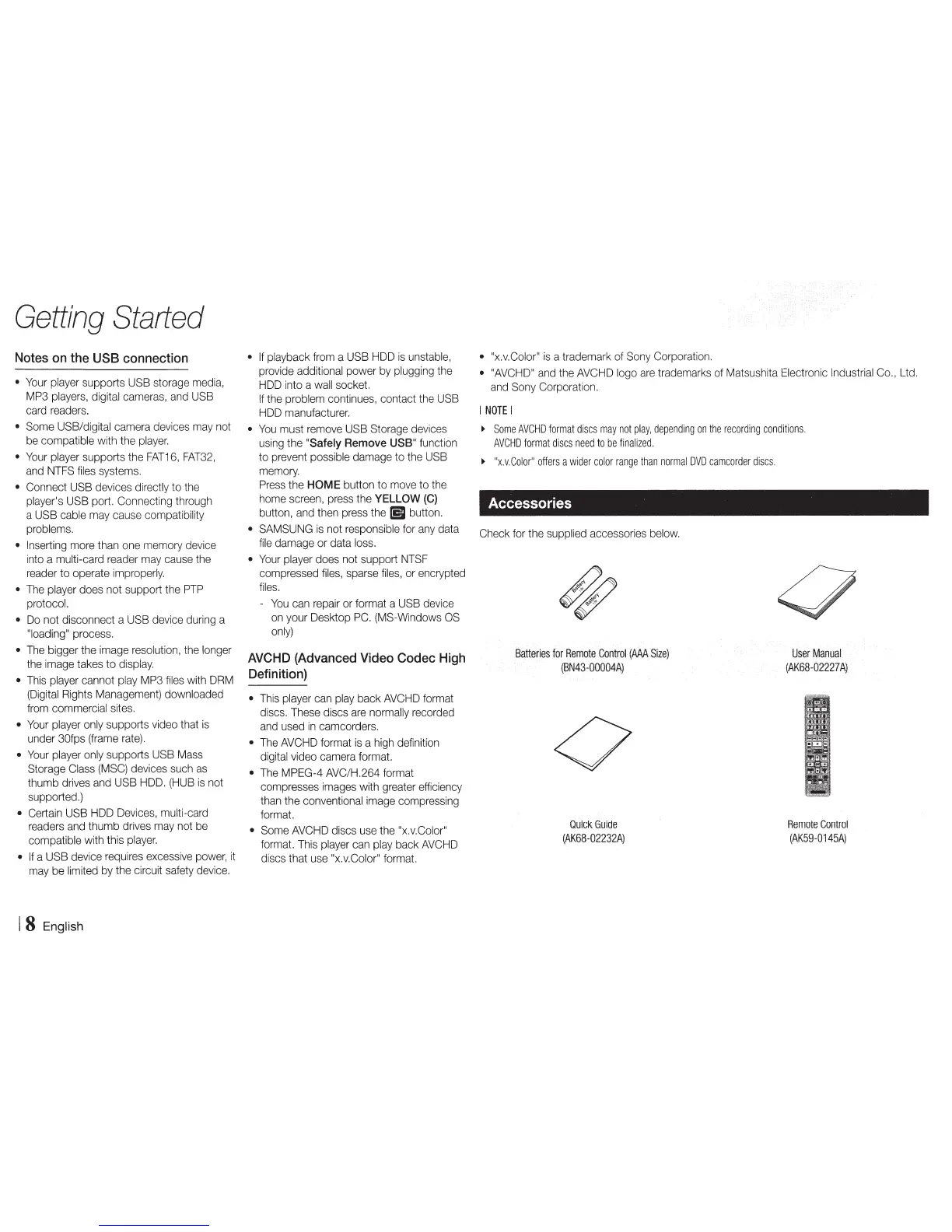 Samsung BD-E5700 - Getting Started: USB Connection and Accessories; USB Connection Notes and Best Practices; Included Accessories List