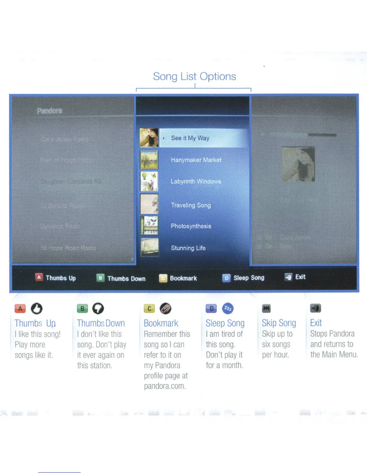 Samsung BD-E5700 - Pandora: Song Interaction Options; Interacting with Songs: Thumbs Up;Down, Bookmark