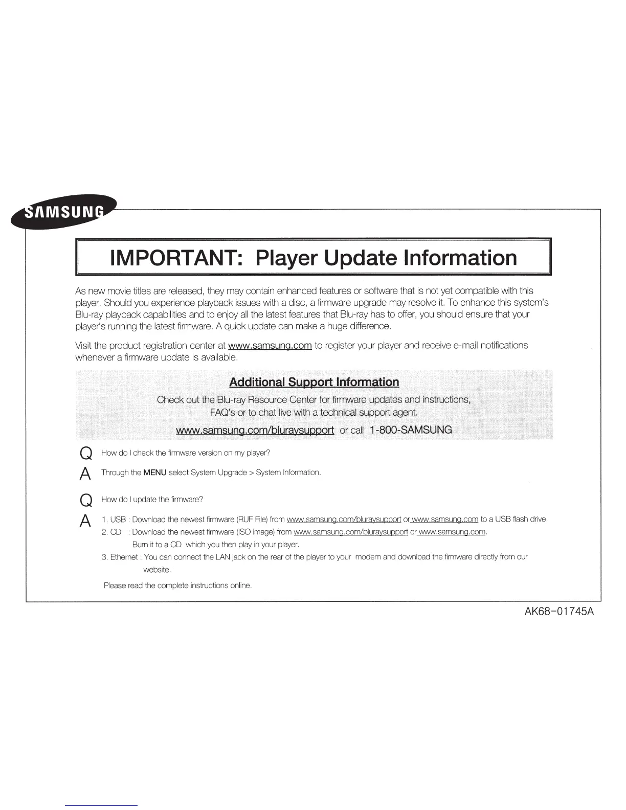 Samsung BD-E5700 - Player Update Information and Support Resources; Important Player Update Information; Additional Support Resources and FAQs