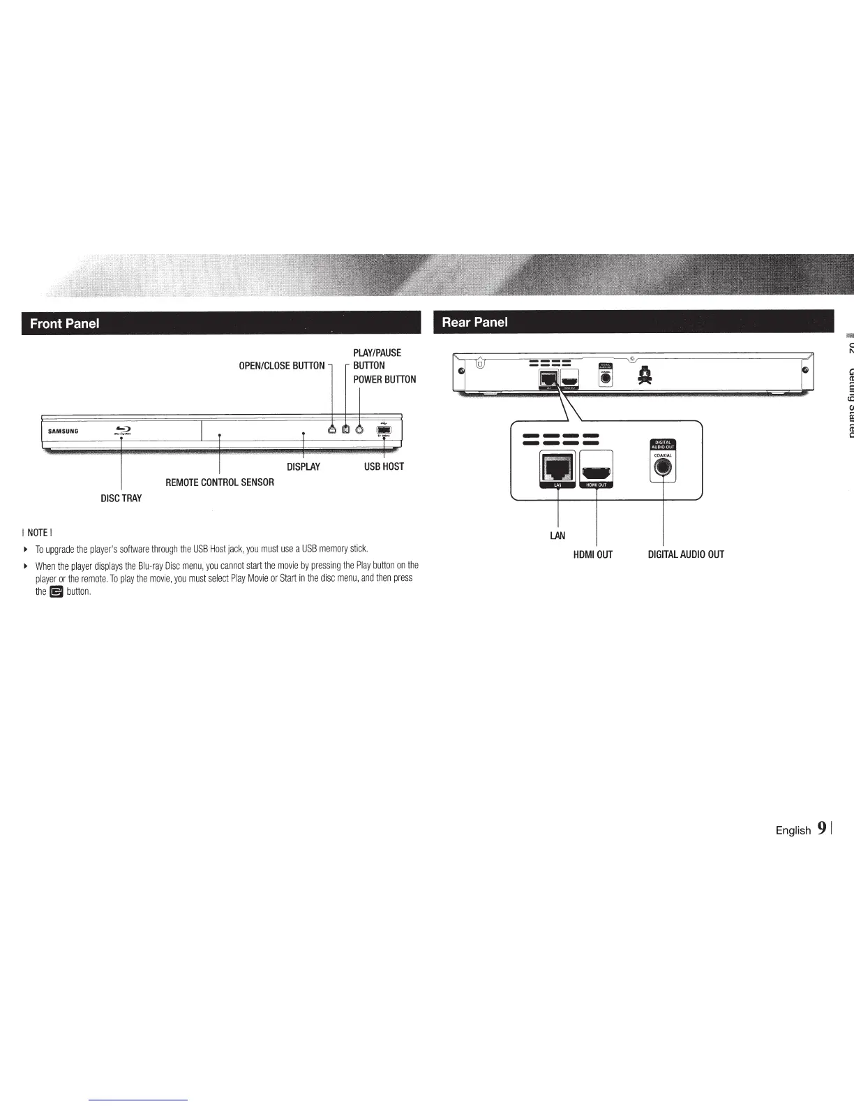 Samsung BD-E5700 - Getting Started: Player Interface Overview; Front Panel Controls and Indicators; Rear Panel Connections and Ports