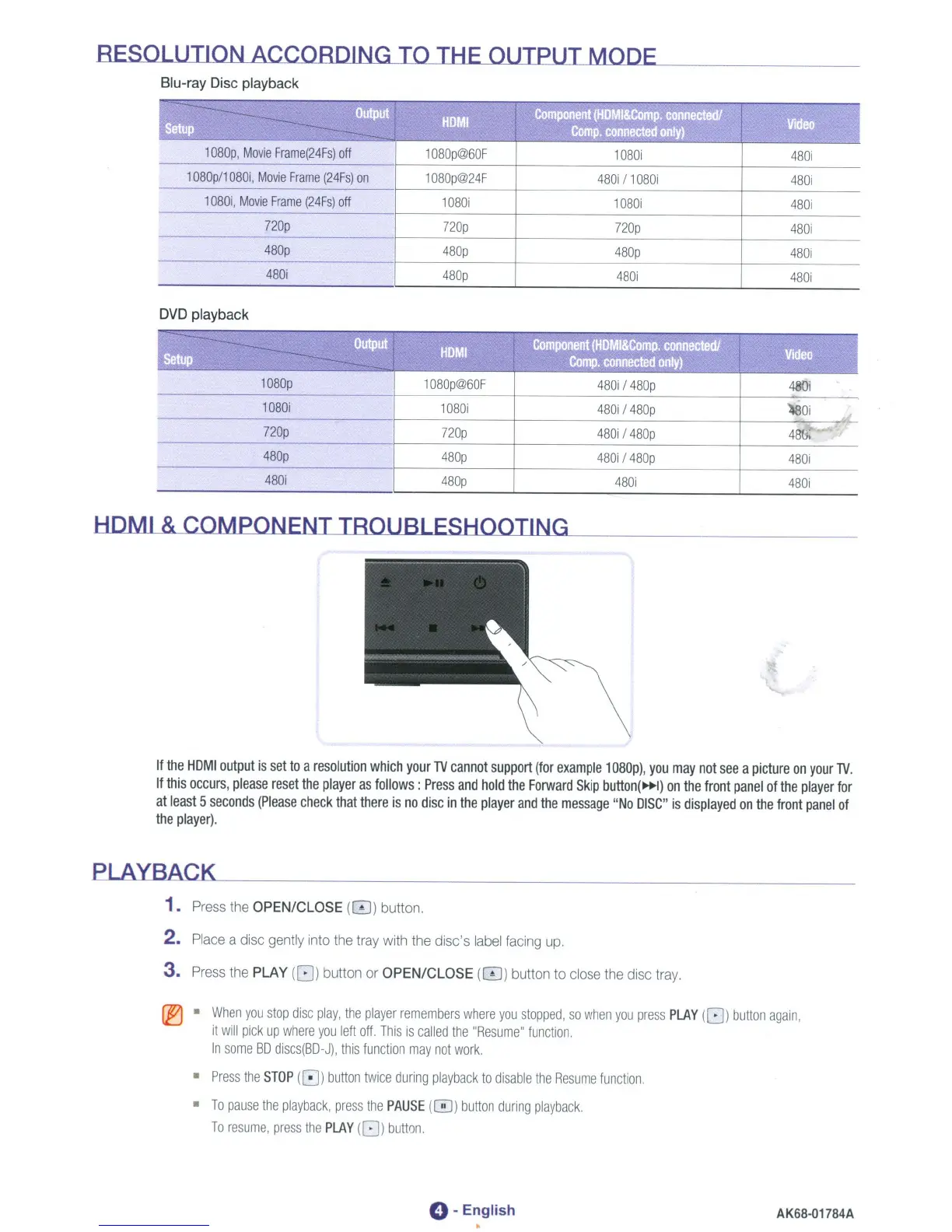 Samsung BD-P1600 - Resolution According to the Output Mode