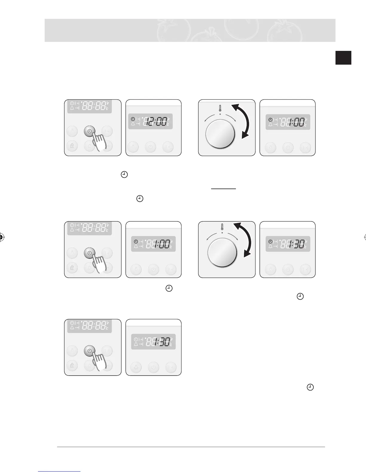 After 3 seconds, an icon of a clock and 12:00 will begin blinking in the display. The oven
