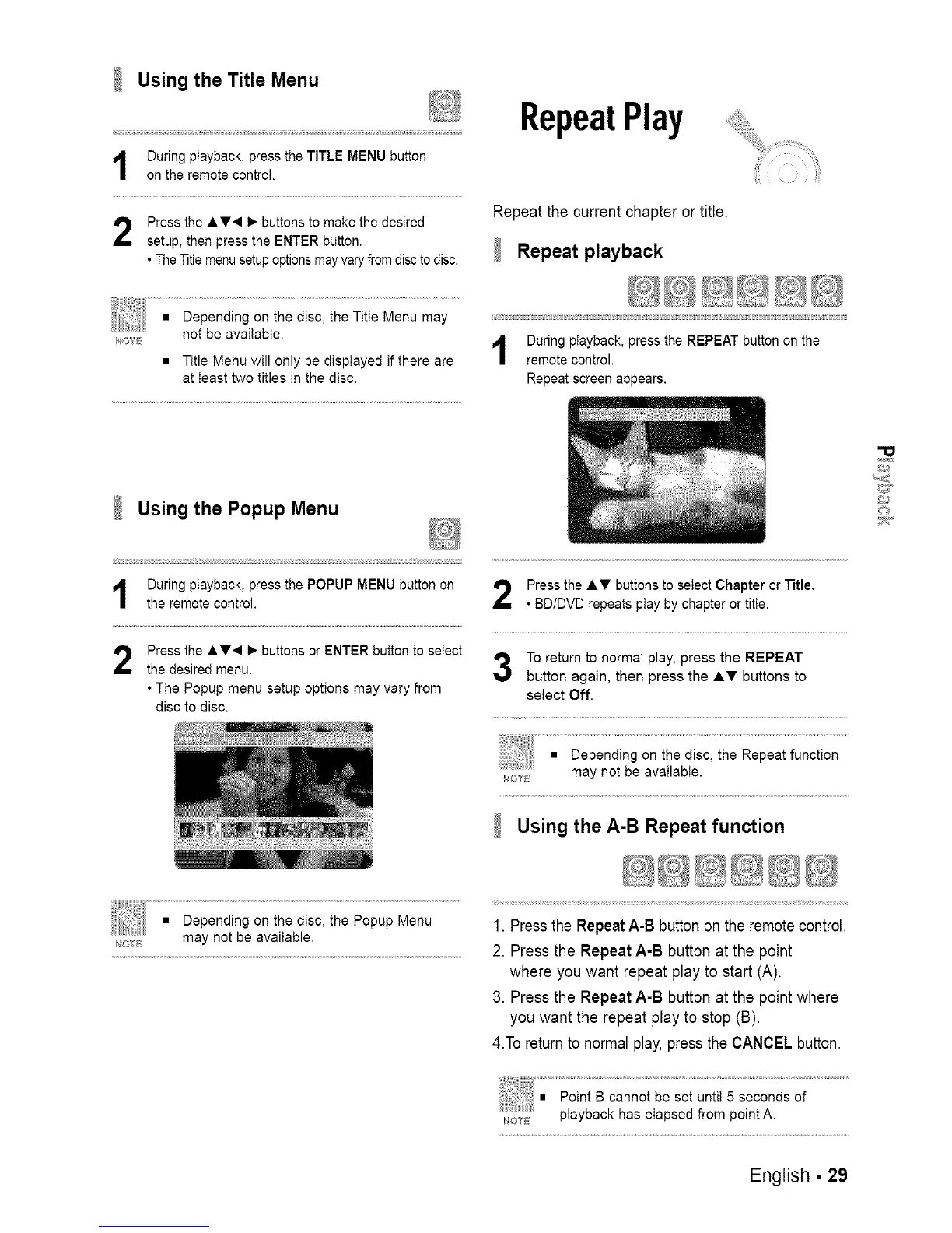• BD/DVD repeats ptay by chapter or title.