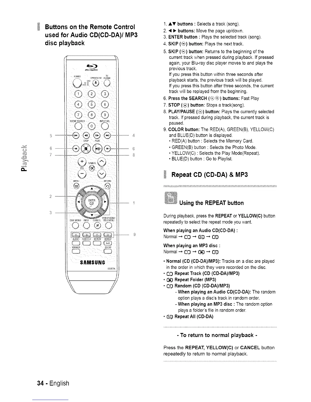 • YELLOW(C) : Selects the Play Mode(Repeat).