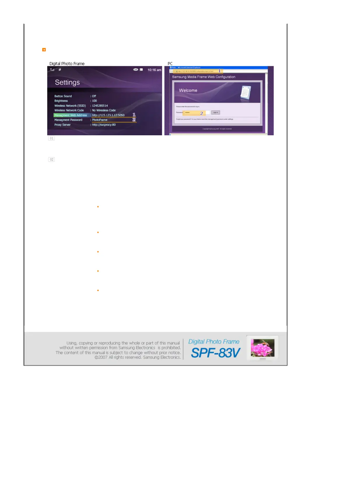 Go to [Settings]-[Management Web Address] in your Photo Frame and then open this URL using Internet Explorer on your