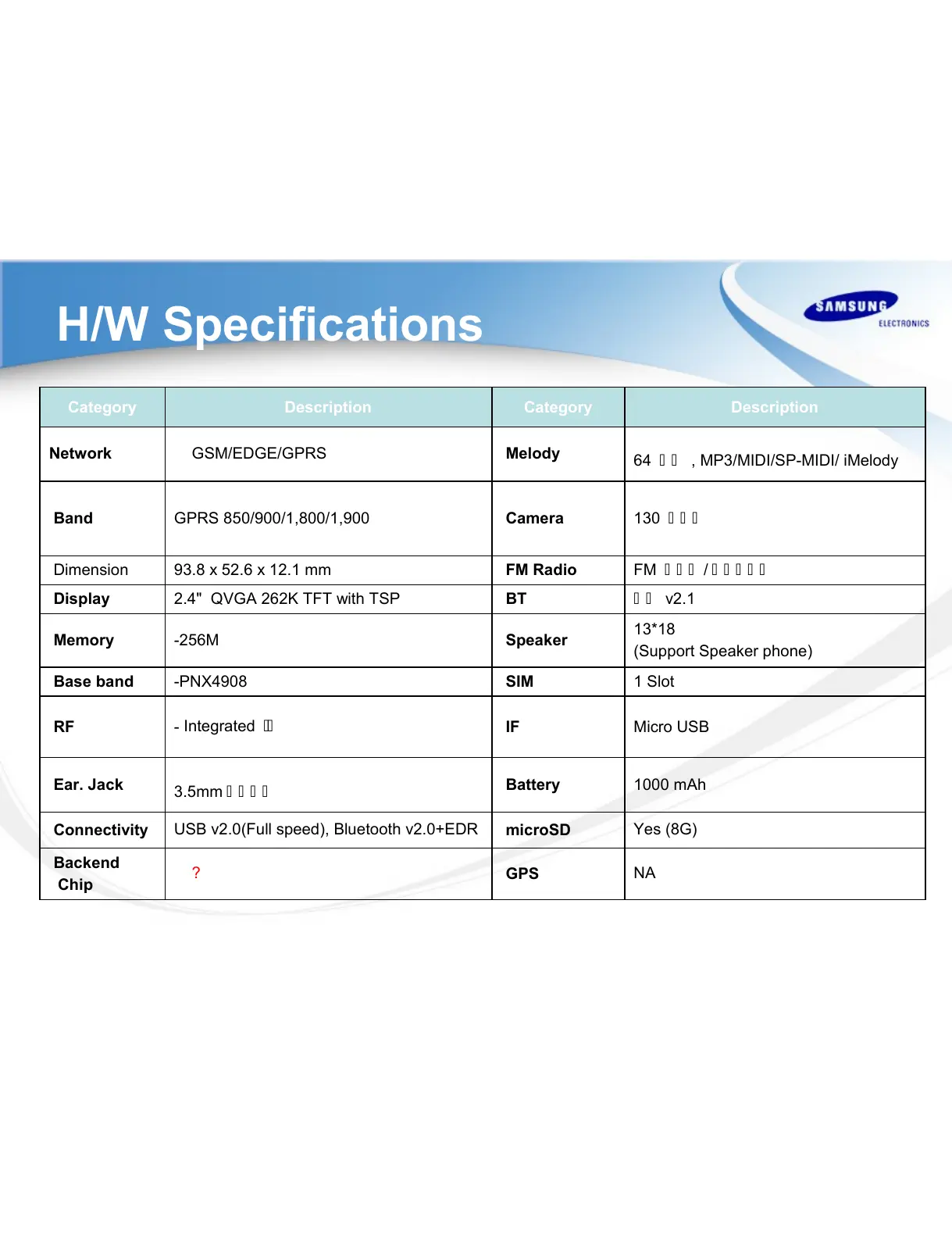 Samsung C3300K - H;W Specifications