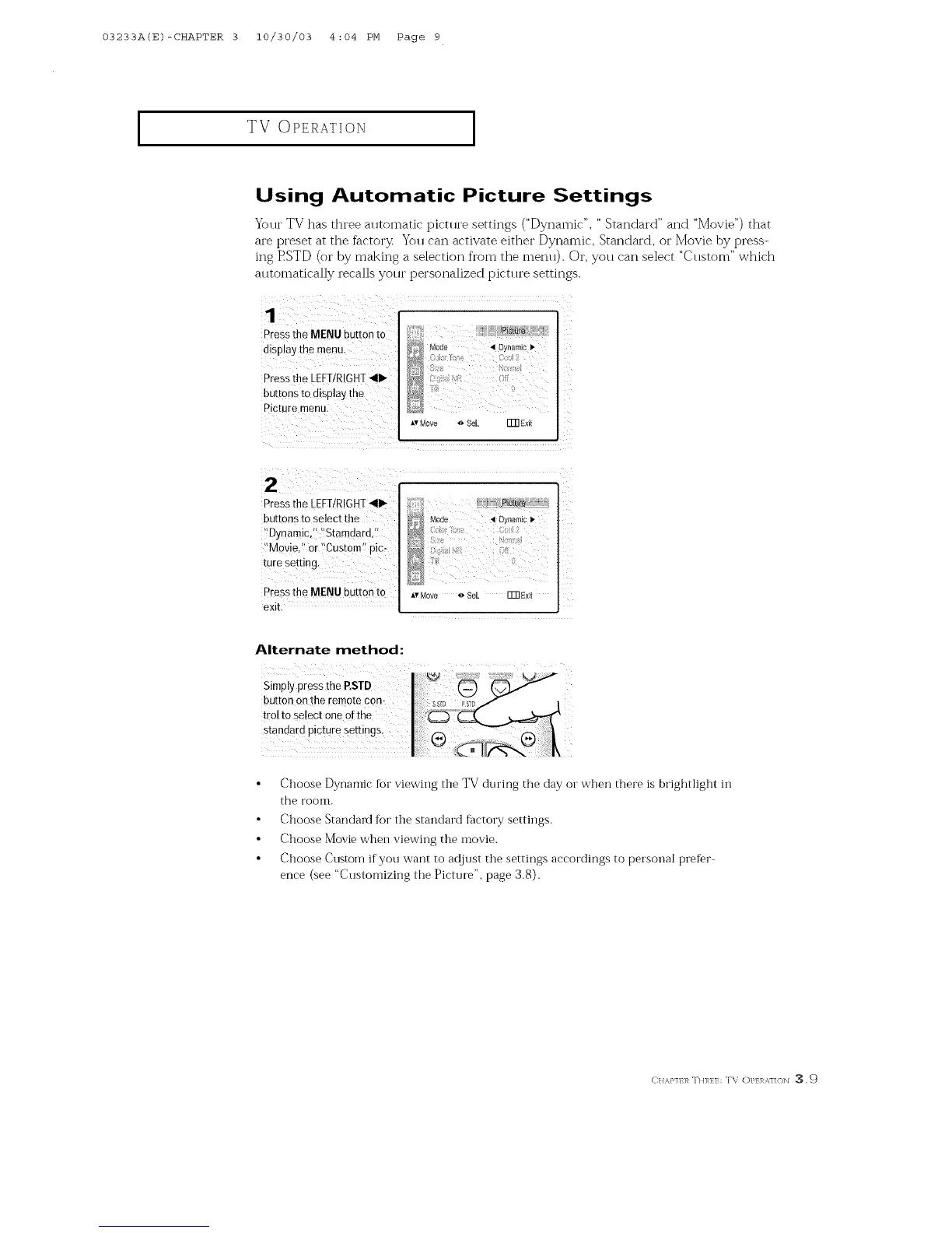are preset at the factory Yoll caI] activate either Dynamic, Standard, oi" Movie by press-