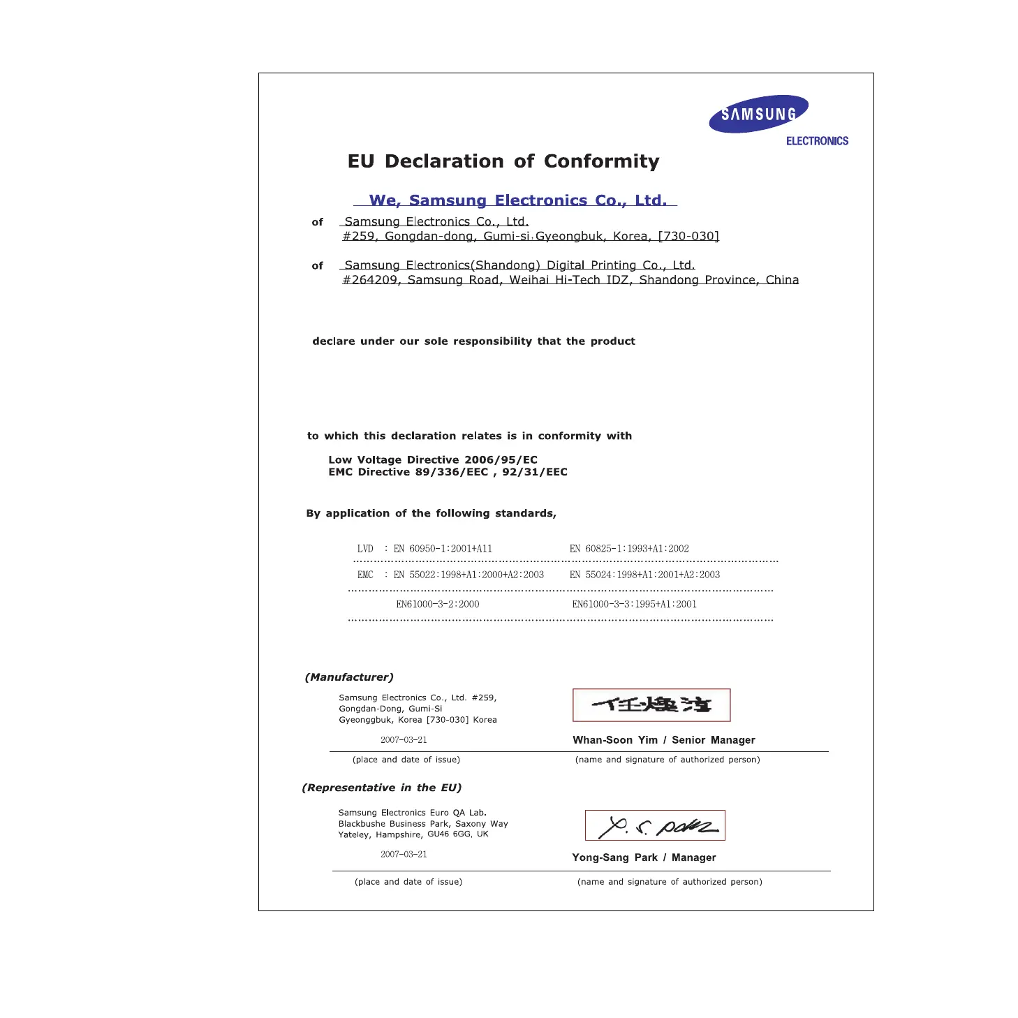 Samsung CLP-310 - EU Declaration of Conformity Details