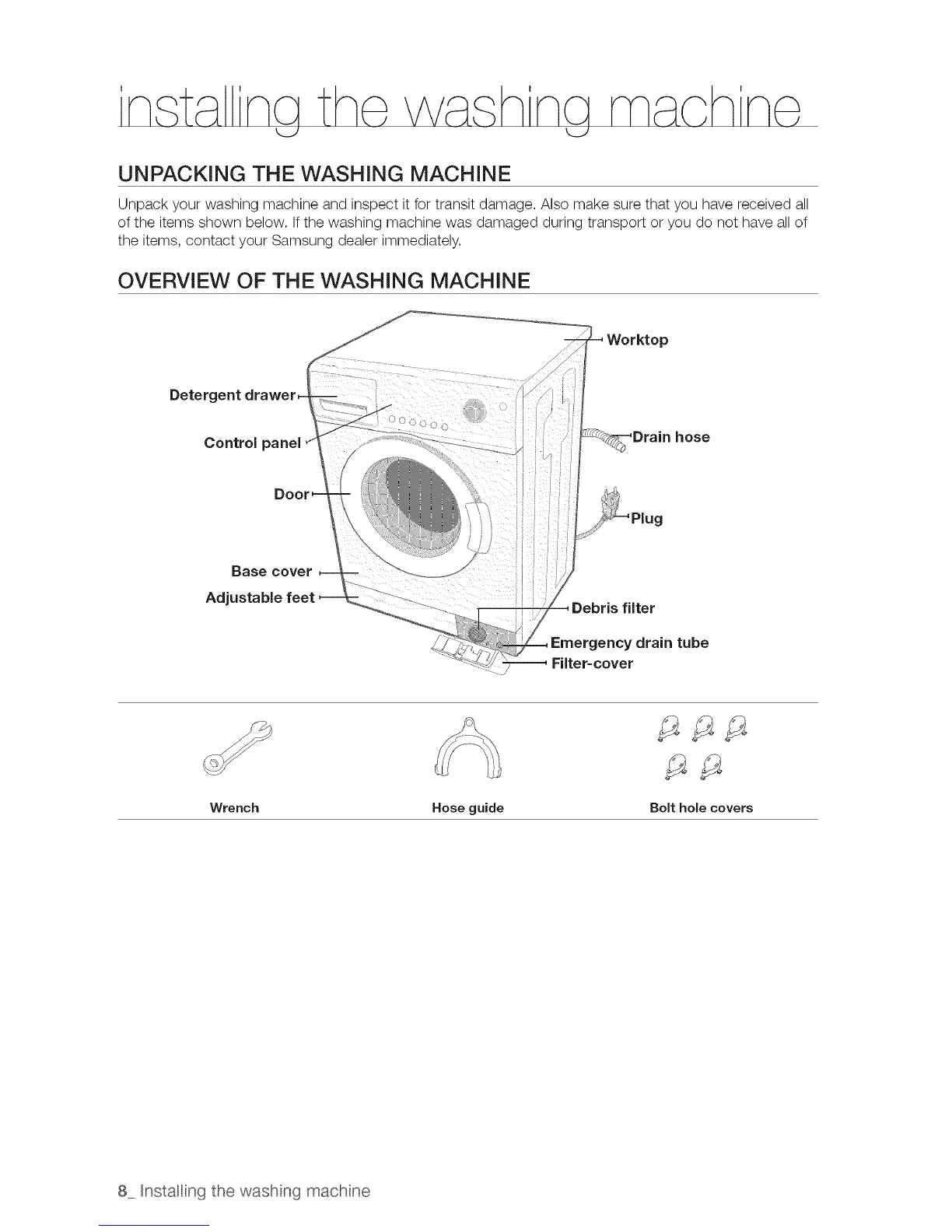 of the items shown below. If the washing machine was damaged during transport or you do not have all of