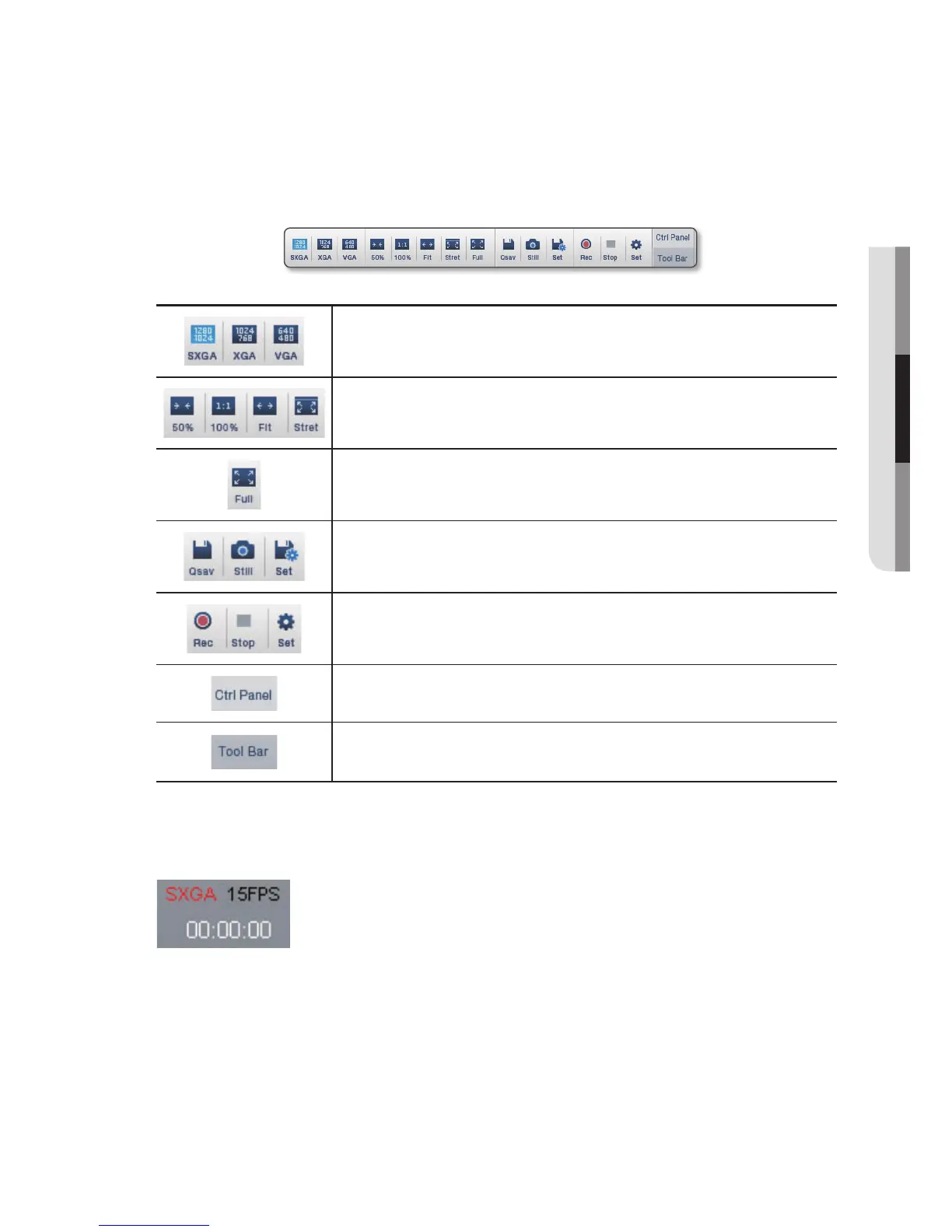 If recording is yet to start, the status bar displays 30FPS for VGA, and 15FPS for SXGA or XGA. The