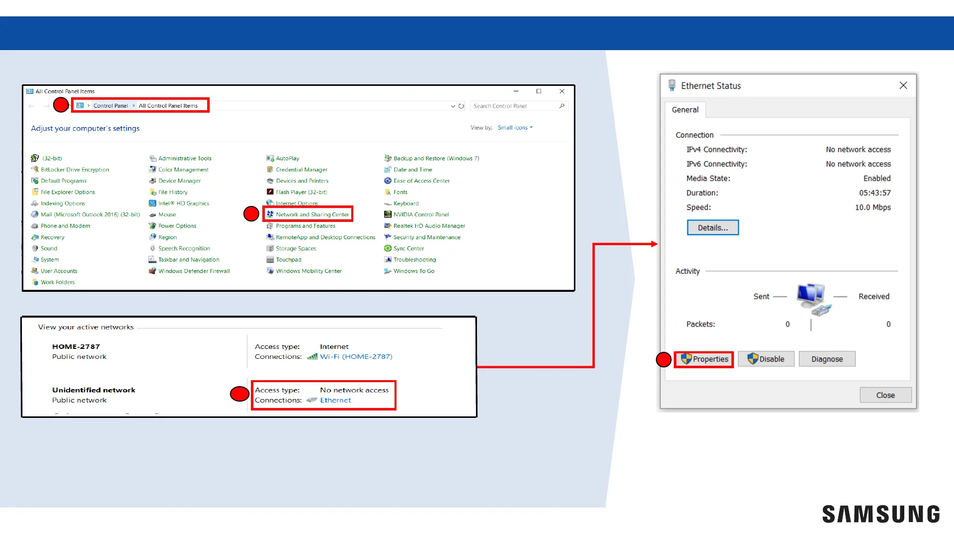 Samsung DMS 2.5 - PC Network Configuration: Accessing Settings; Navigate to Network Settings; Identify Ethernet Connection; Open Ethernet Properties