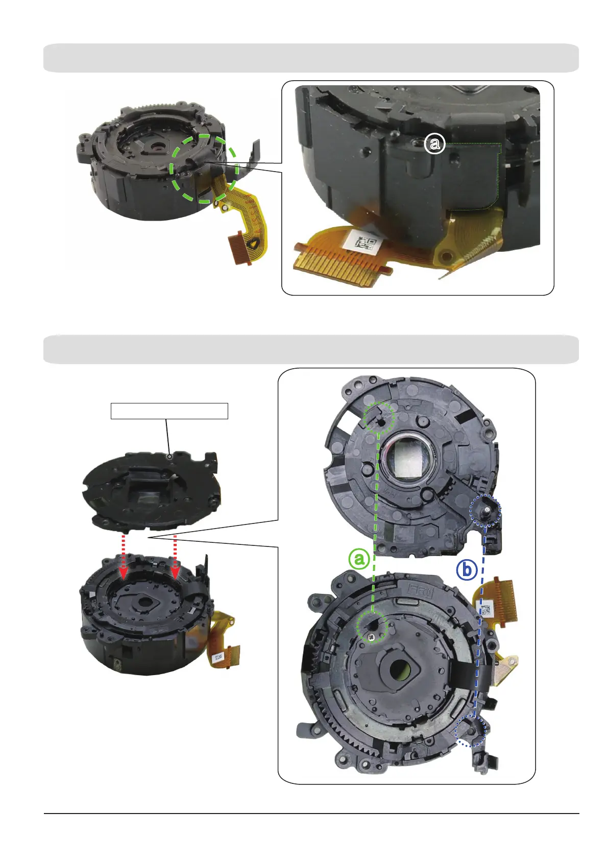 (h) Assemble the ASSY LENS BASE-D5 by aligning the part “a" with "b” as illustrated.