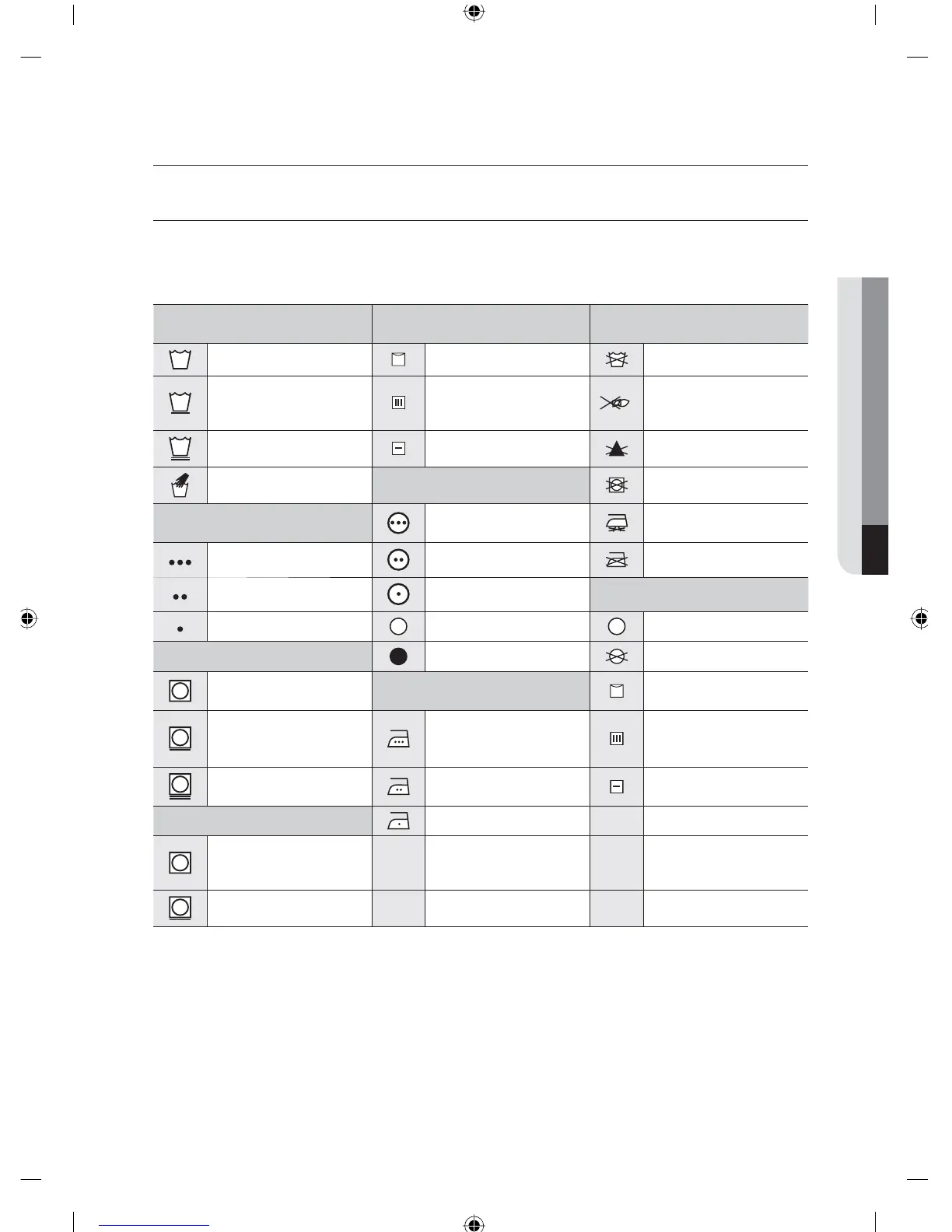 The following symbols provide garment care direction. The Clothing care labels include symbols for