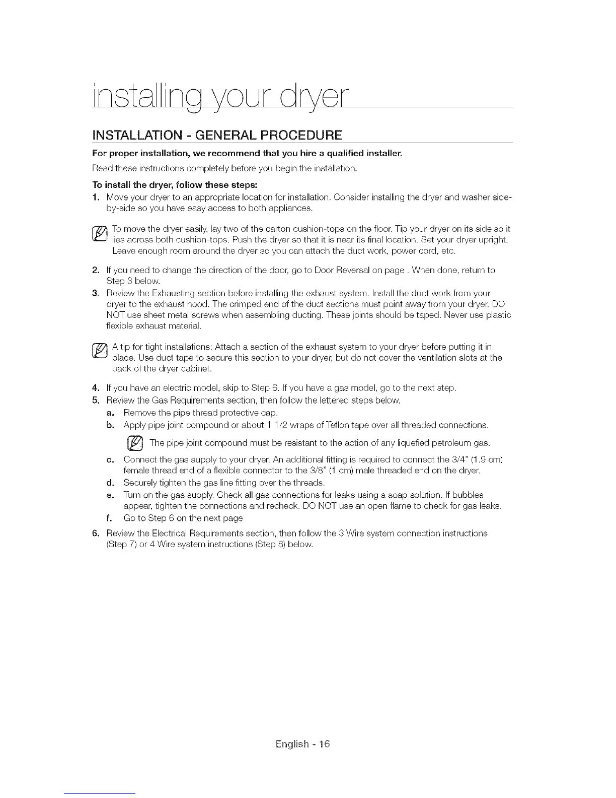 t. Move your dryer to an appropriate location for installation. Consider installing the dryer and washer side-