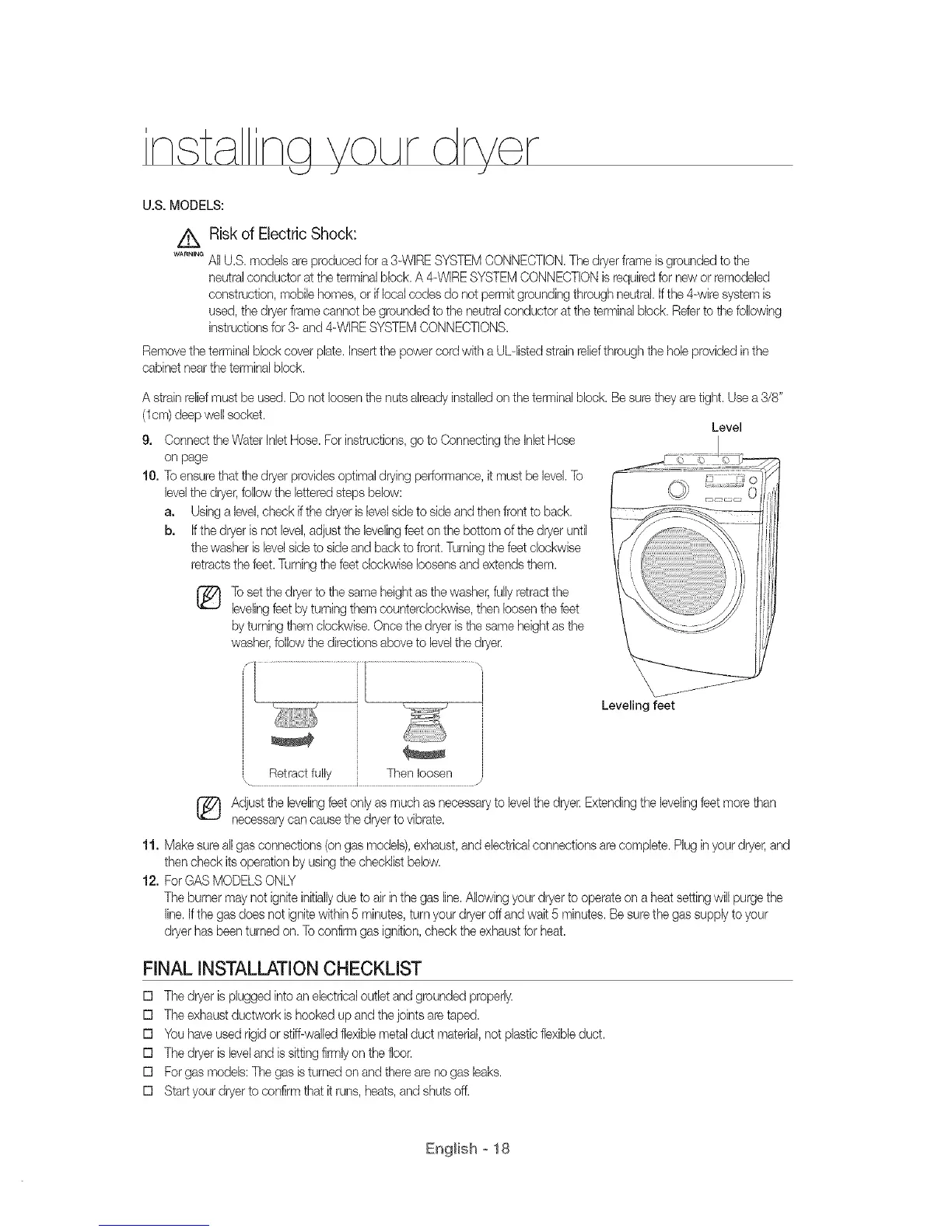 [_ djust the leveling feet one/as much as necessary to levelthe dryer Extending the leveling feet more than