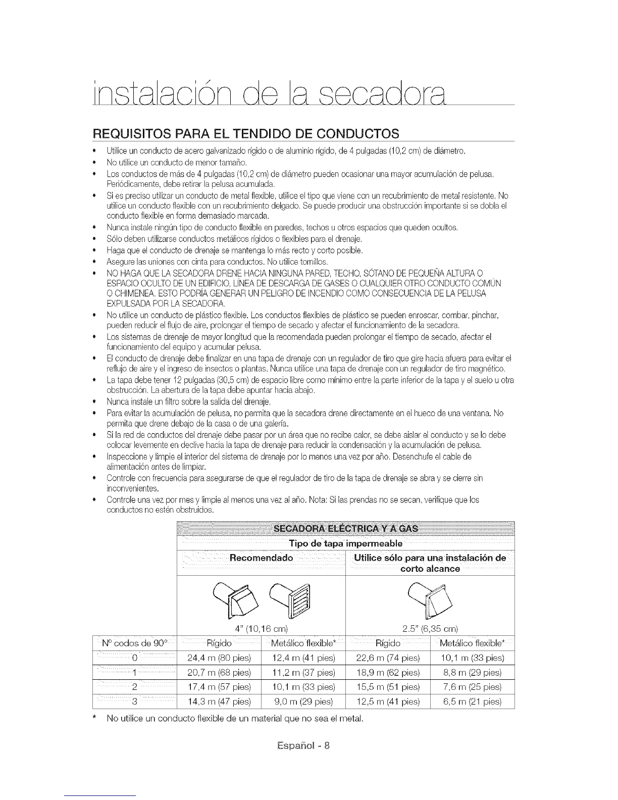 Utilice un conducto de acero galvanizado rfgido o de aluminio rfgido, de 4 pulgadas (10,2 cm) de diametro.