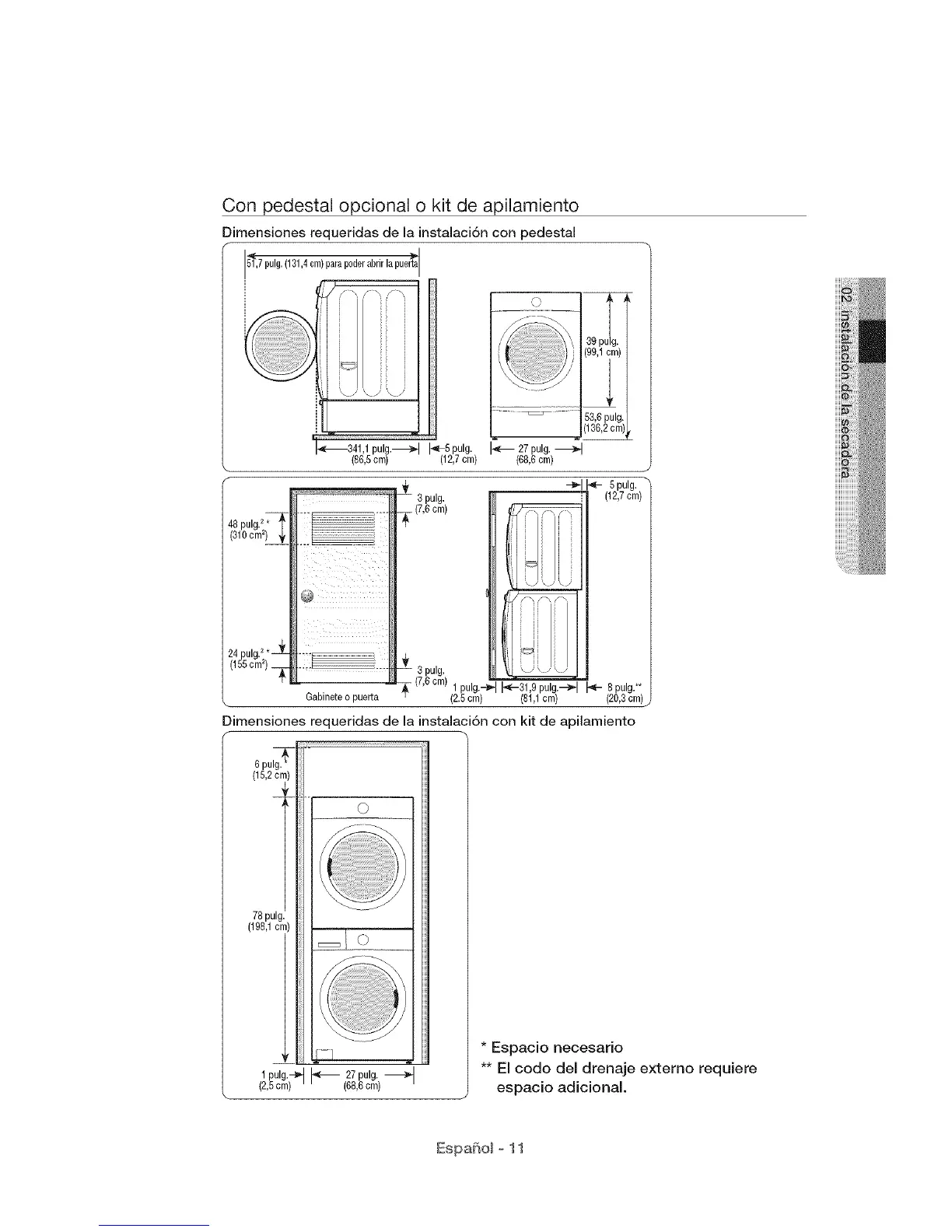 Dimensiones requeridas de la instalaci6n con kit de apilamiento