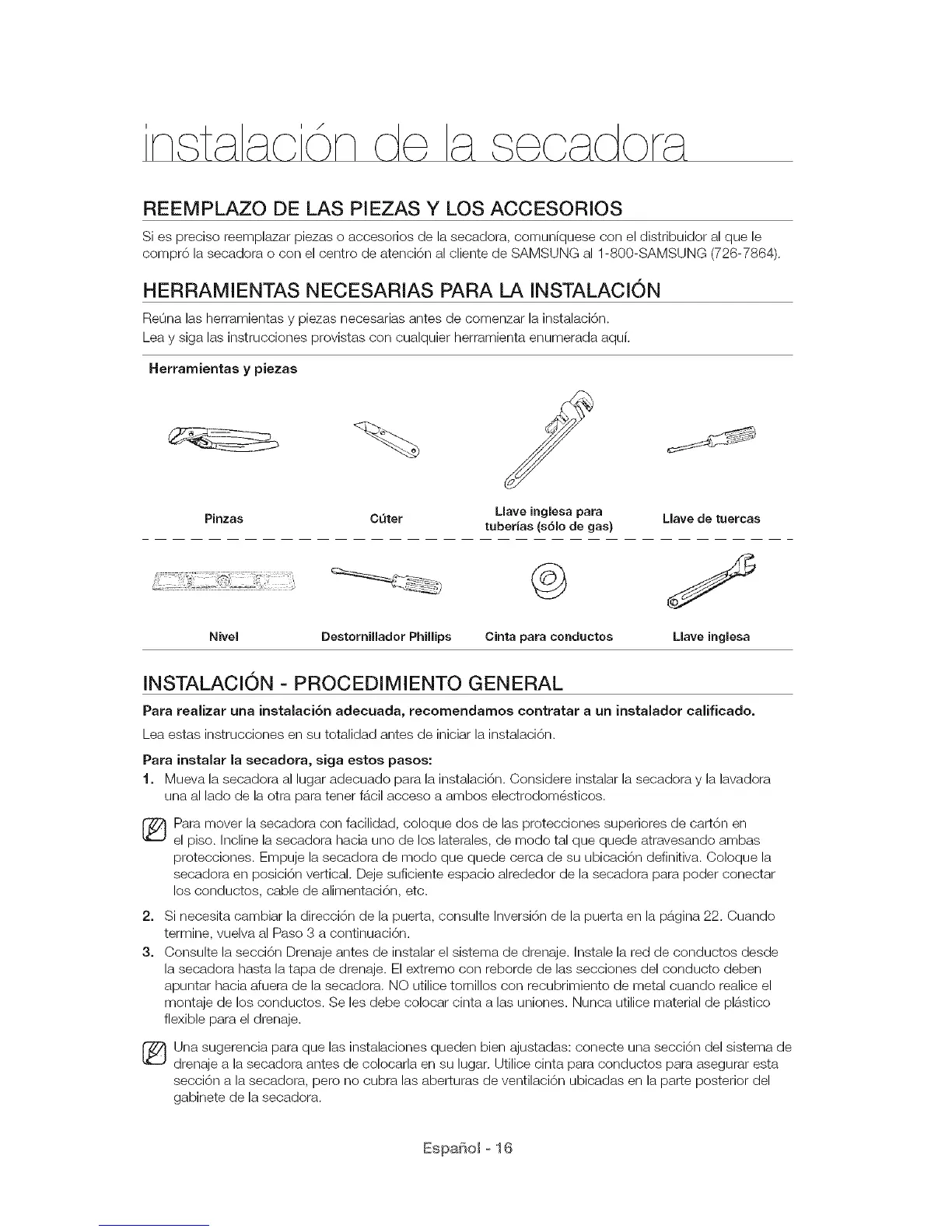 compr6 la secadora o con el centro de atenci6n al cliente de SAMSUNG al 1-800-SAMSUNG (726-7864).