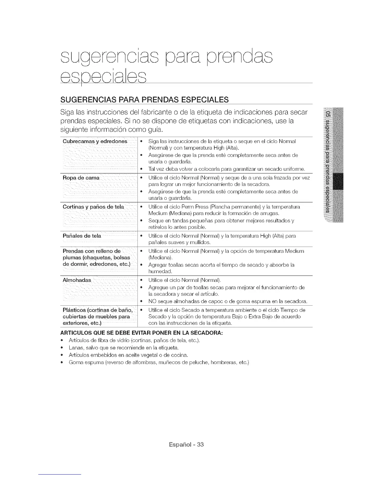 Pa6ales de tela o Utilice el ciclo Normal (Normal) y la temperatura High (Alta) para