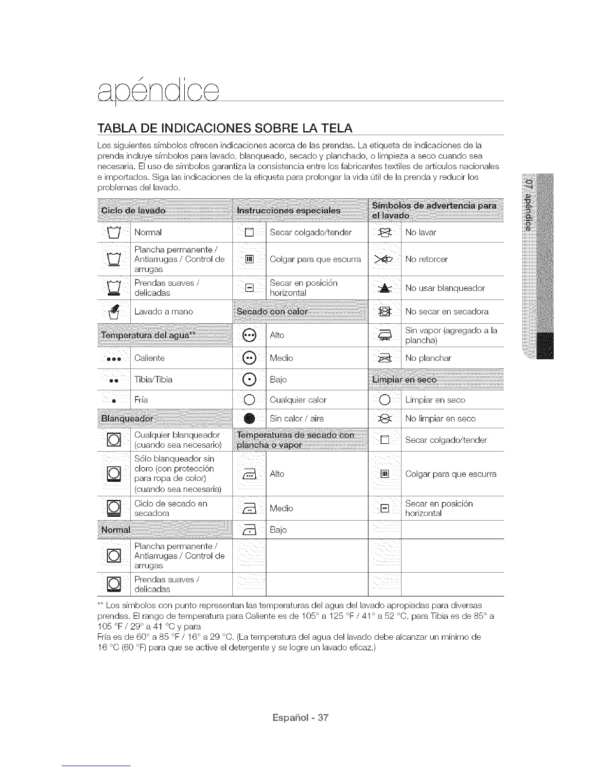 Frfa es de 60 ° a 85 °F / 16 ° a 29 °C. (La temperatura del agua del lavado debe alcanzar un mfnimo de