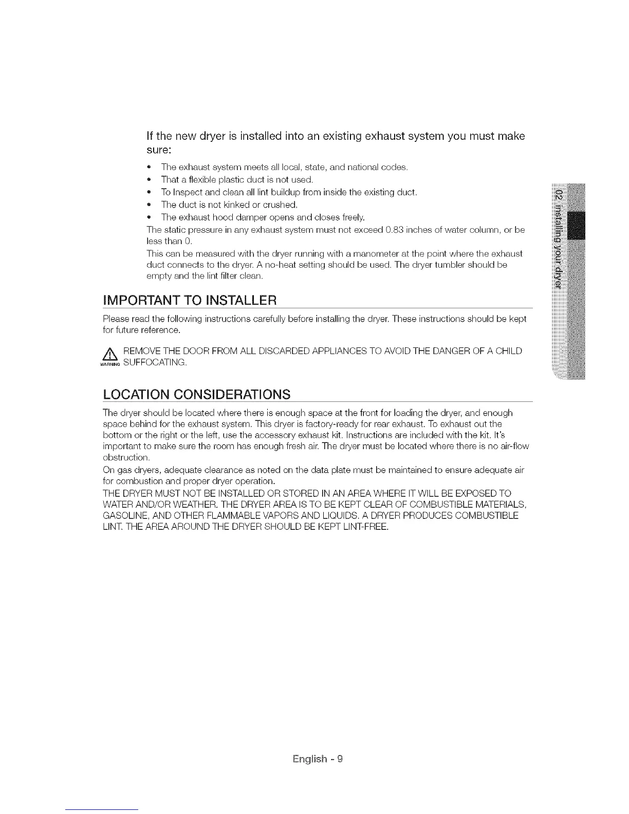 WATER AND/OR WEATHER. THE DRYER AREA IS TO BE KEPT CLEAR OF COMBUSTIBLE MATERIALS,