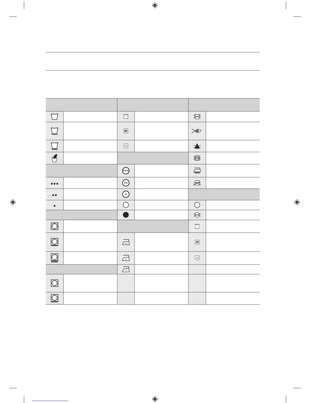 The following symbols provide garment care direction. The Clothing care labels include symbols for