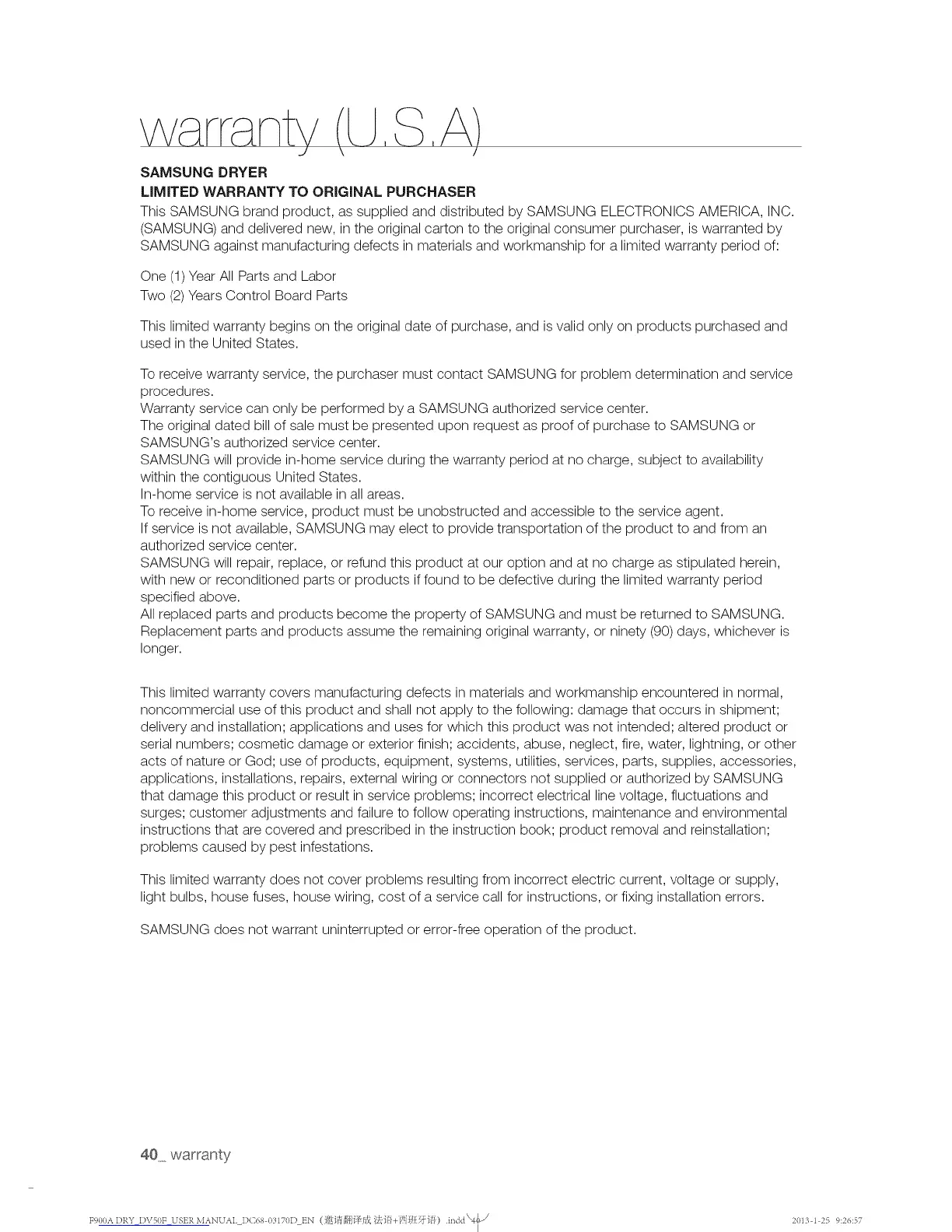 Warranty service can only be performed by a SAMSUNG authorized service center.