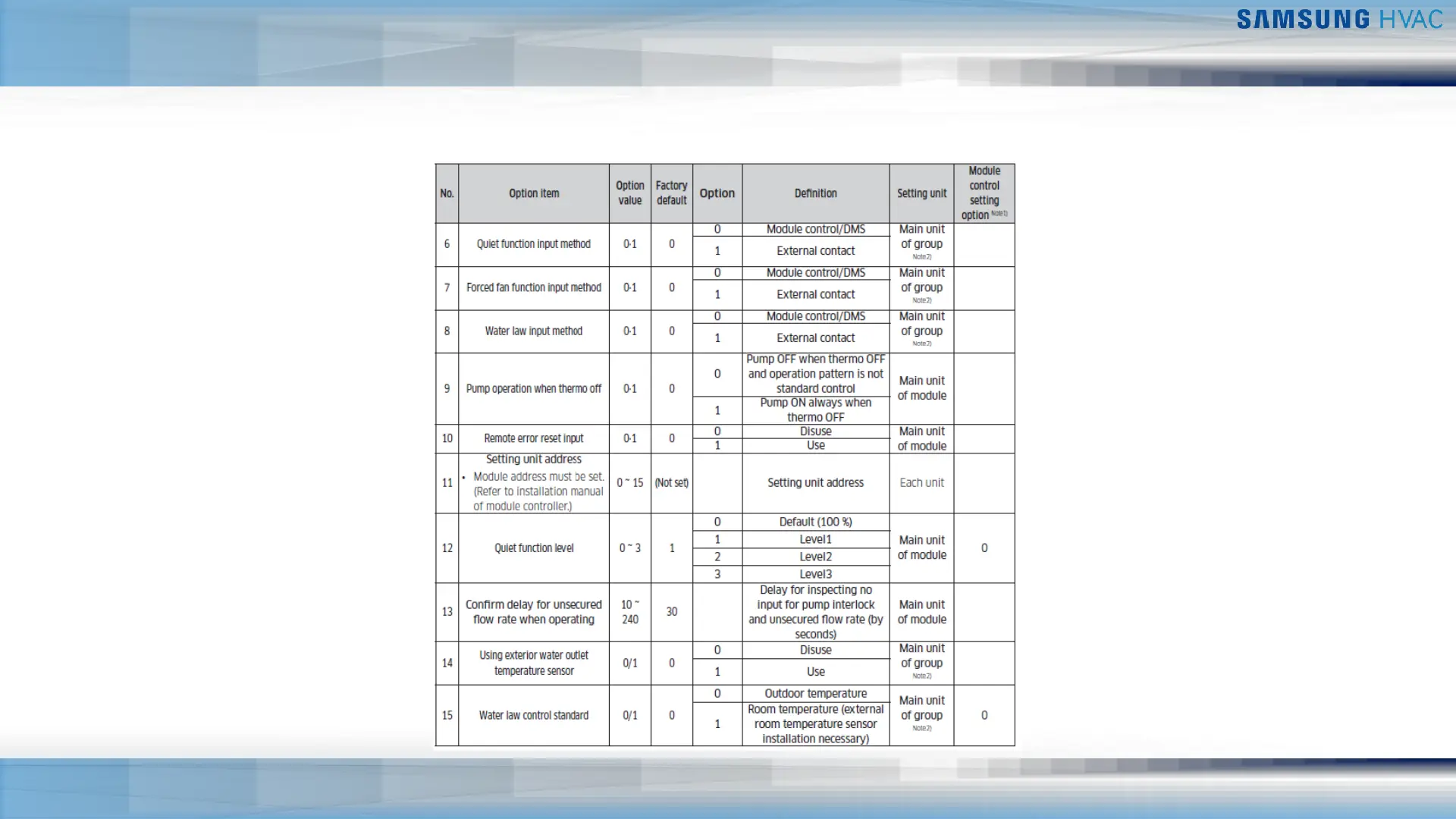 Samsung DVM Chiller - Hydro Controller Option Settings List - Continued
