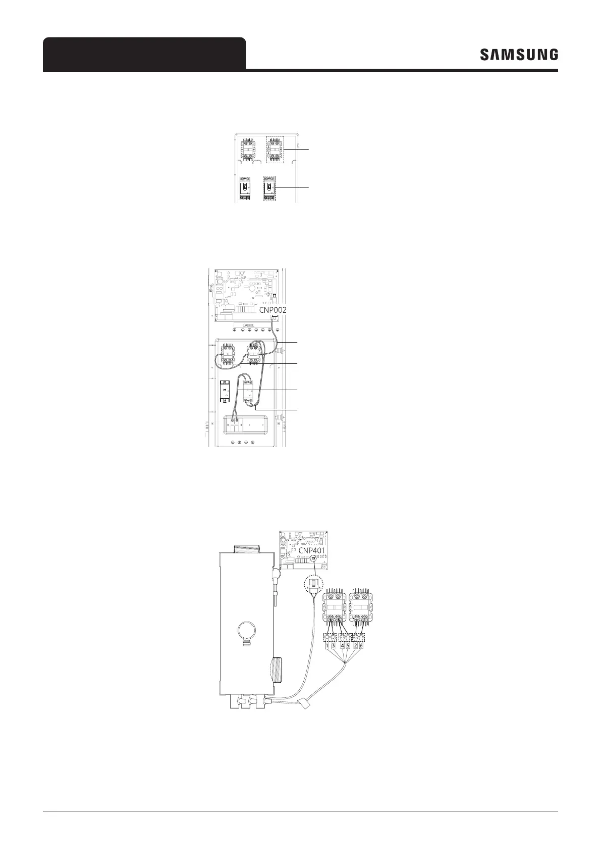 5 Connect the wires of ① Assy heater parts to the PBA connector (CNP401) and ② Magnetic contactor, as shown in the