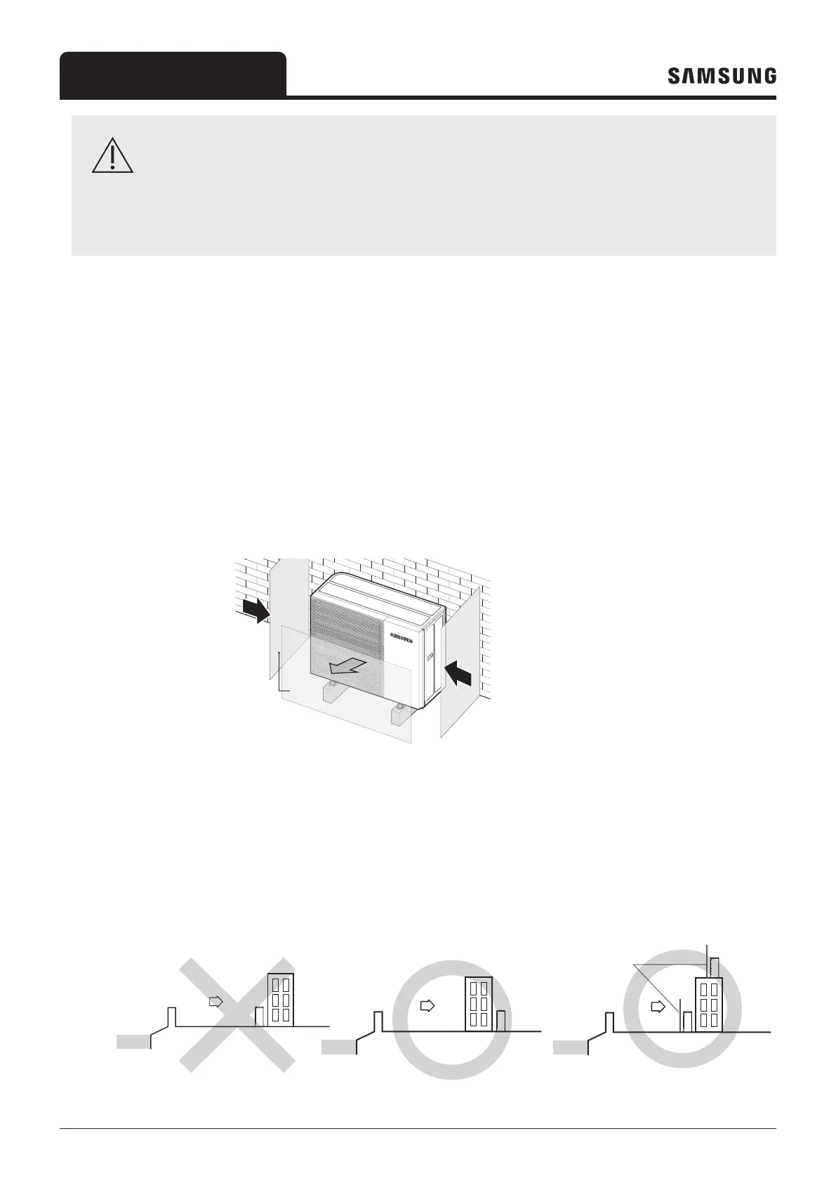 wind facing the outdoor air outlet, it causes a short circuit. This can lead to performance degradation, broken fan