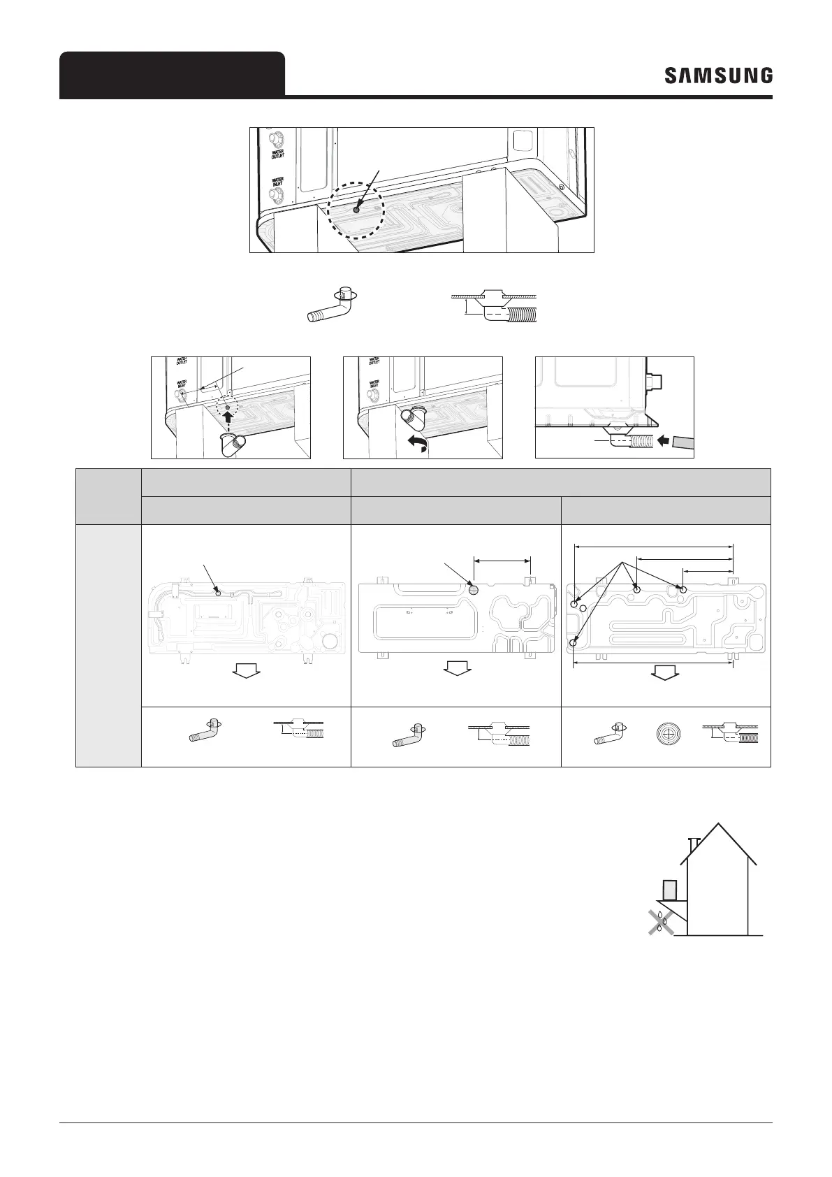 Dropped water from condenser shall be eliminated through running drain holes to prevent Ice growing at low temperature.