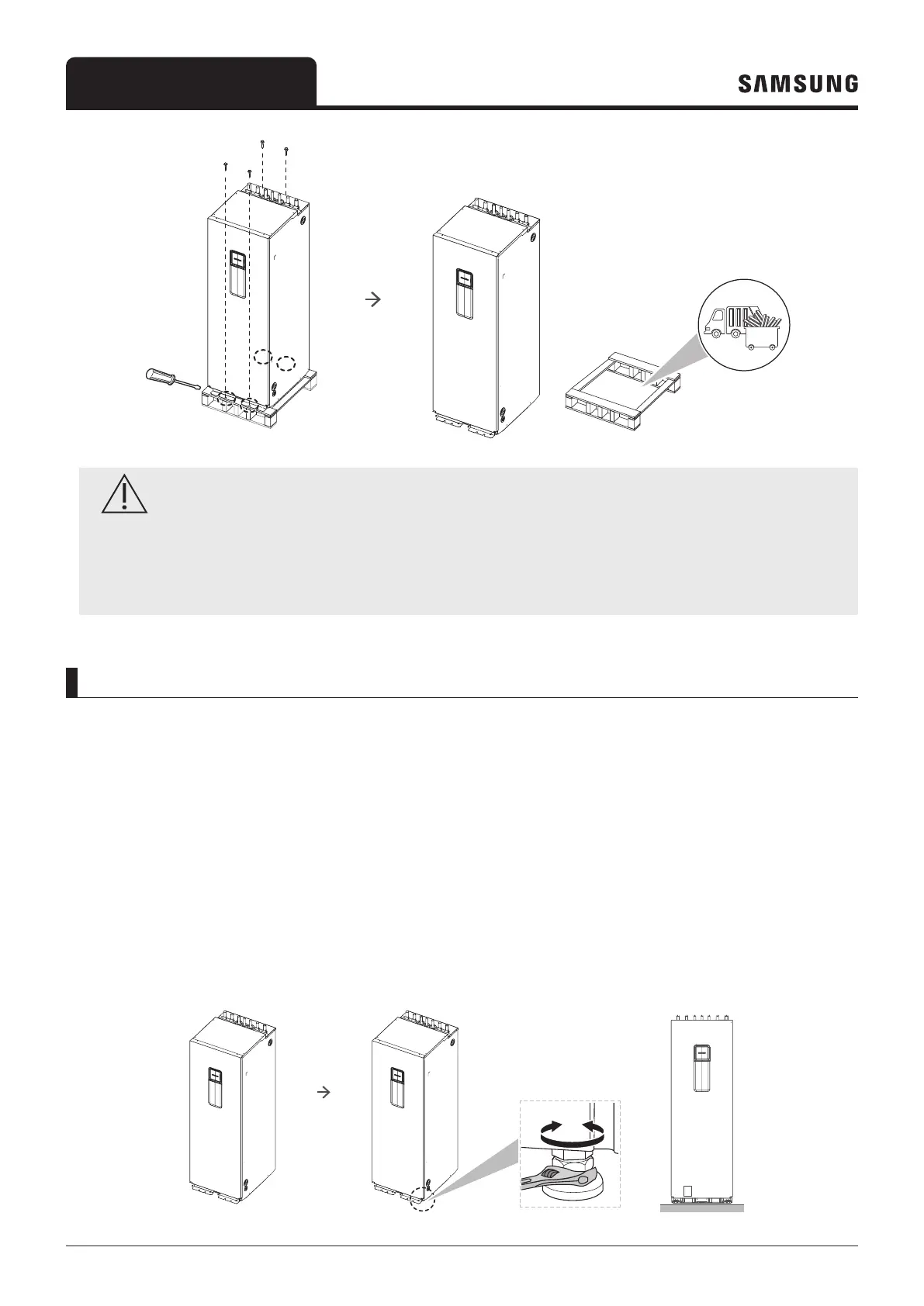 • Be sure to remove the wood en pallet from the bottom side of the unit base panel before fixing the unit