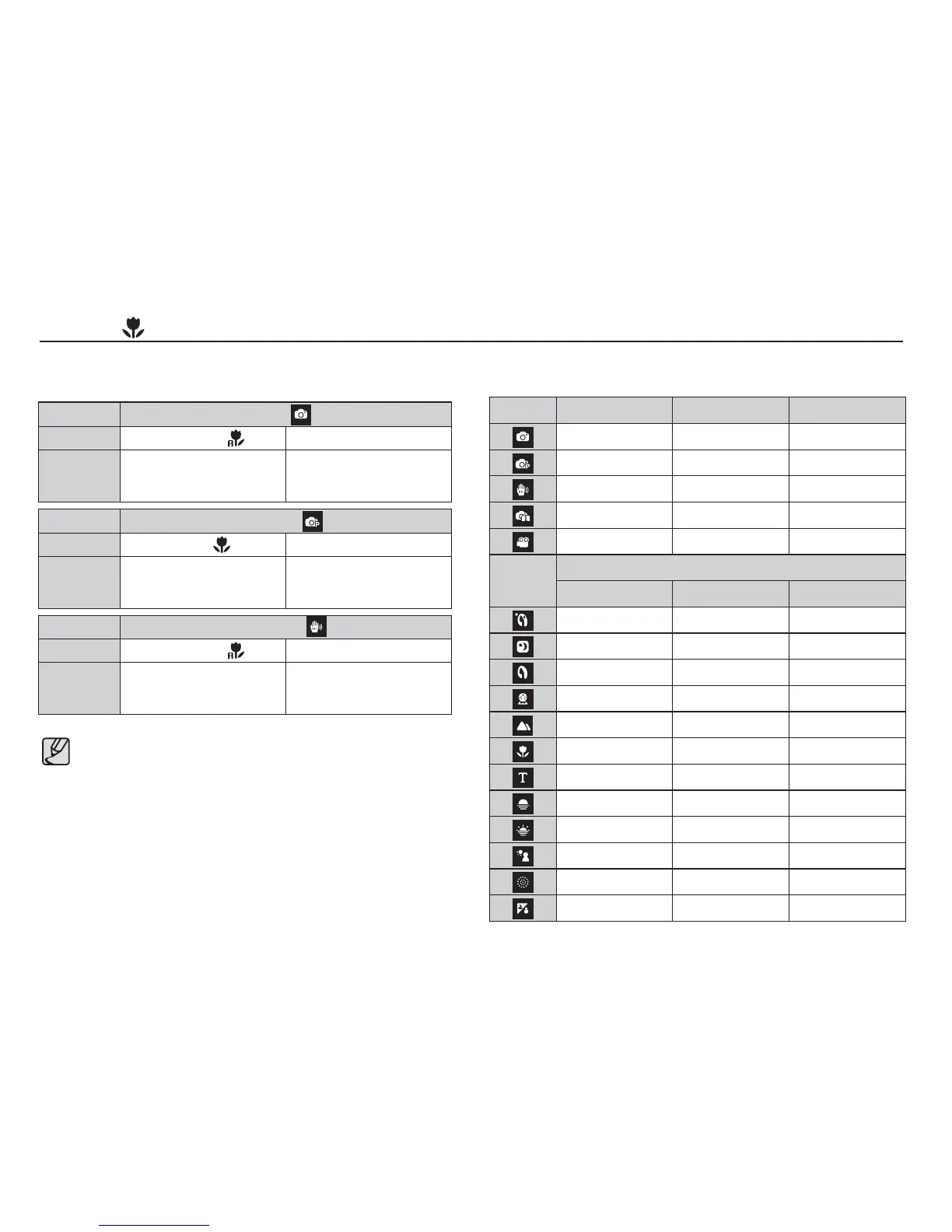 Types of focus mode and focus range (W : Wide, T : Tele)